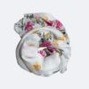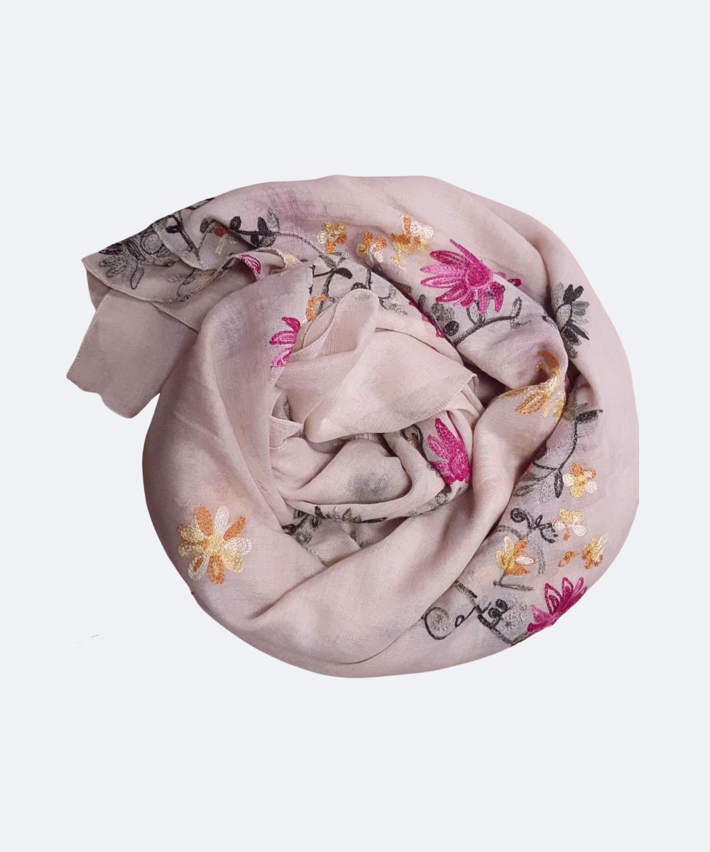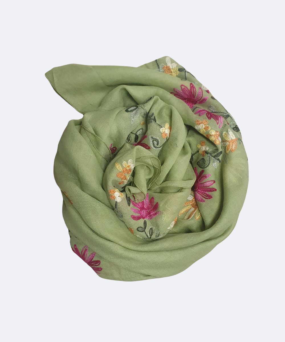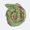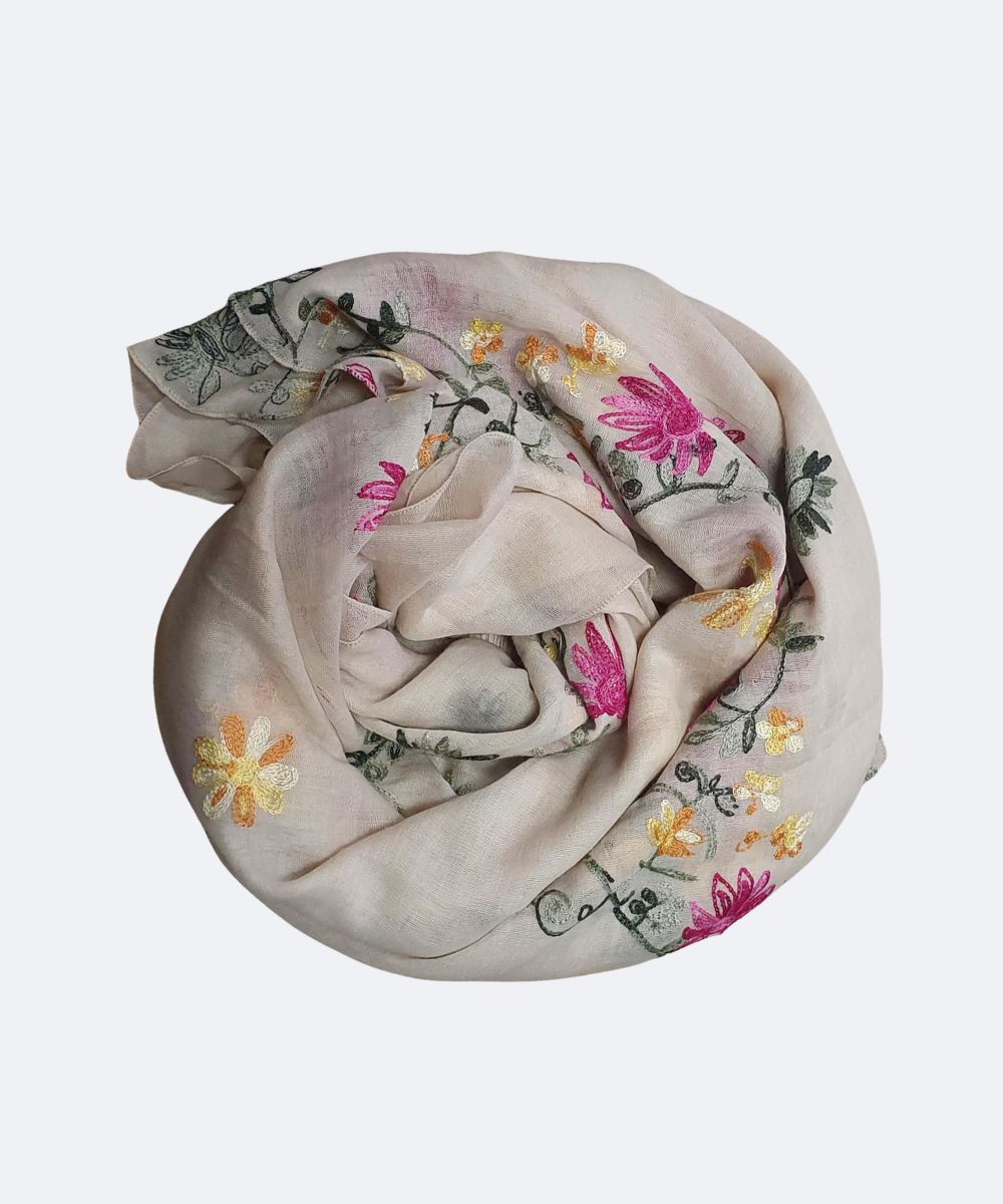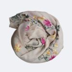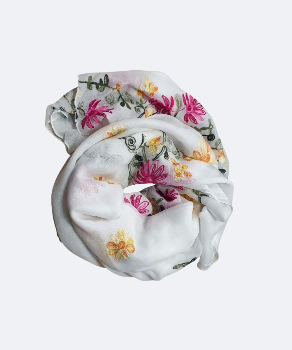 Apaszka- Szal ma bazowy kolor biały lub kremowy i jest ozdobiony kolorowym haftem w motywy kwiatowe, w odcieniach różu, żółci i zieleni. Wykonany jest z cienkiego, przewiewnego materiału, który sprawia, że jest miękki i przyjemny w dotyku. Jest to uniwersalny dodatek, który można nosić na wiele sposobów – tradycyjnie na szyi, jako chustę, narzutkę na ramiona w letnie wieczory, a nawet na włosach chroniąc glowe przed wiatrem .