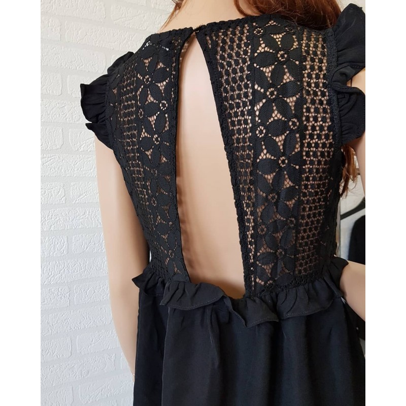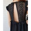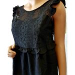 To czarna bluzka , która łączy w sobie elegancję koronki i dziewczęcy urok falbanek. Głęboka czerń nadaje jej klasyczny i elegancki wygląd. Górna część wykonana jest z ażurowej koronki . Bluzka jest bez rękawów, a wokół ramion i na dole tułowia (w talii) znajdują się falbanki, które dodają jej lekkości i romantyzmu i Łączy elementy klasyki i stylu boho. Bluzka ma lekkie marszczenie zszyte , nie rozciągające.