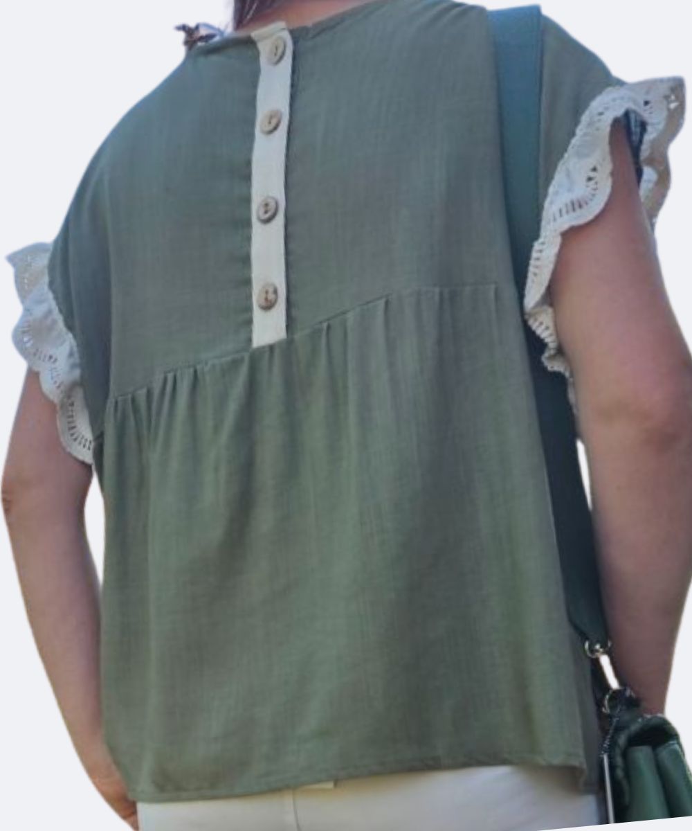 Zielona bluzka z beżową koronką . Bluzka idealnie sprawdzi się w codziennych stylizacjach . Z tyłu bluzki znajduja się guziki naszywane , które dodają uroku do bluzki