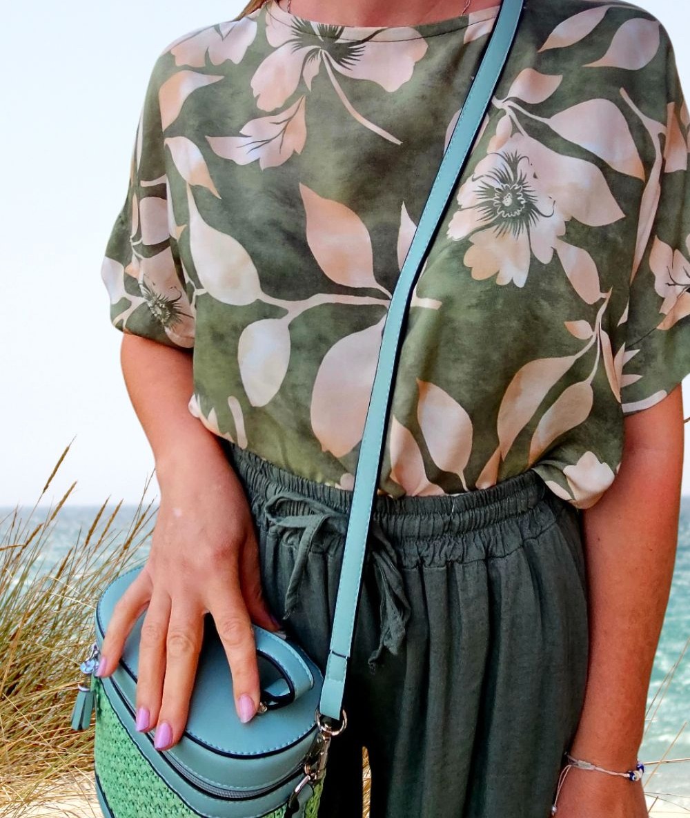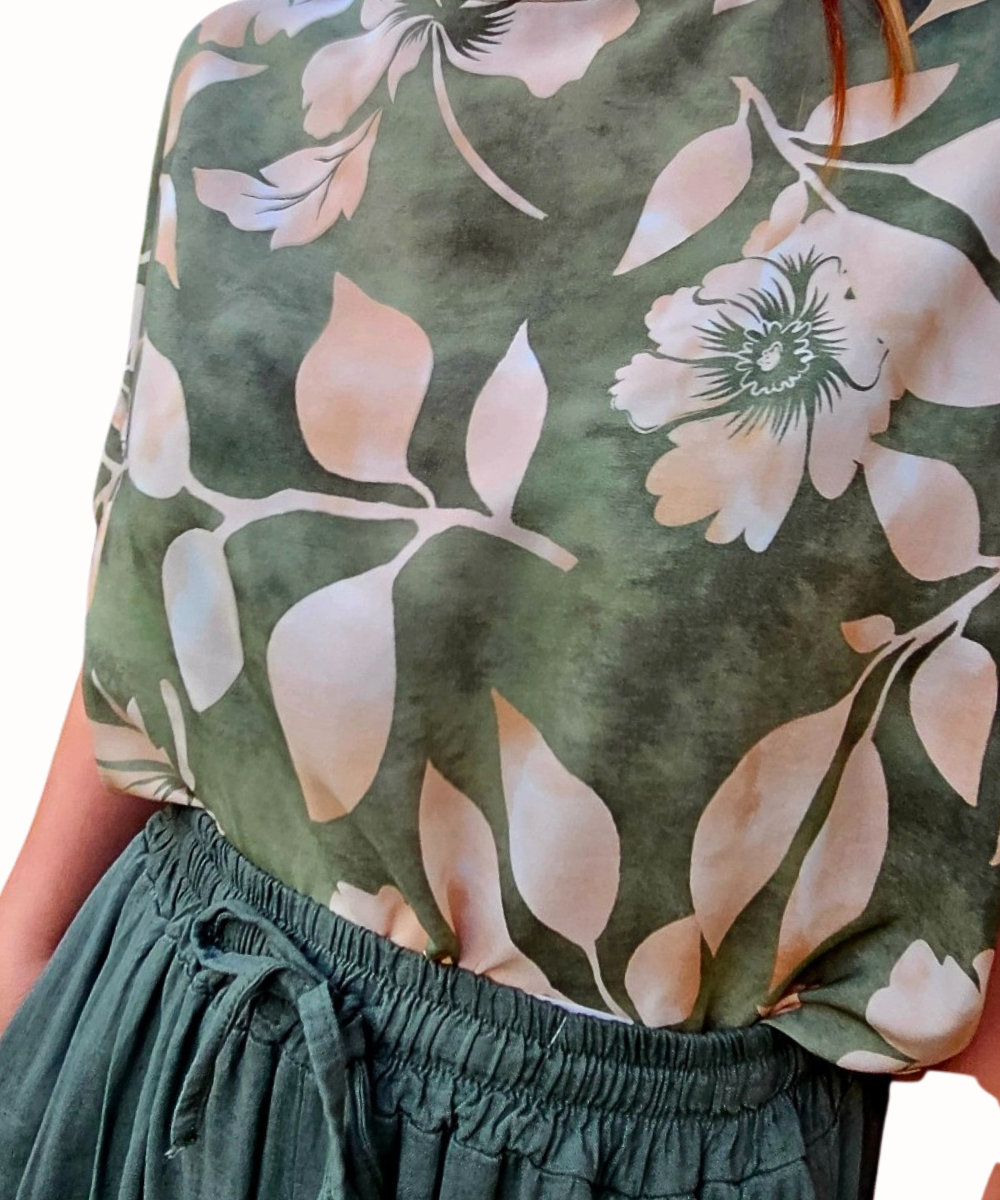 Lekka , kobieca bluzka , w kwiatowy wzór na zielonym tle , to idealny wybór na co dzień i na specjalne okazje