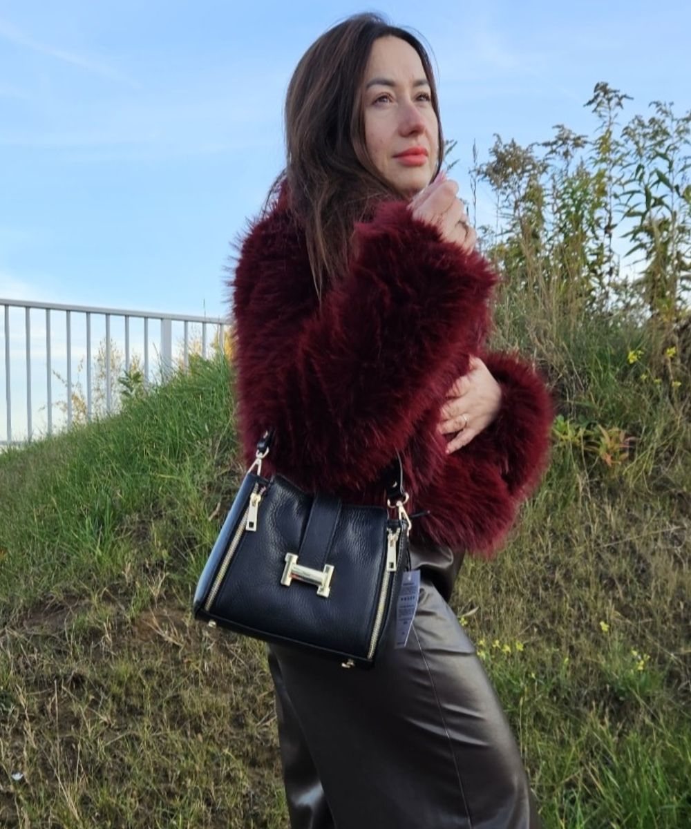 Czarna torebka skórzana , ozdobiona imitującymi zamkami po bokach to modny i wyrazisty dodatek. Łączy w sobie klasyczną elegancję czarnego koloru z nowoczesnym, rockowym akcentem w postaci metalowych suwaków, które pełnią funkcję dekoracyjną, Torebka posiada odpinane ucho do ręki i jest zasuwana na zamek . W środku torebki znajduję sie kieszonka .
