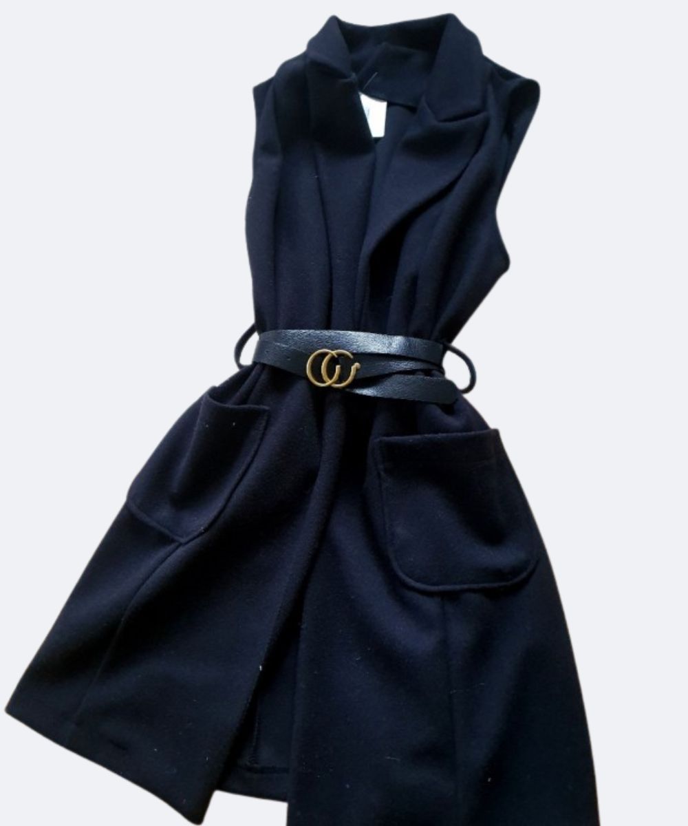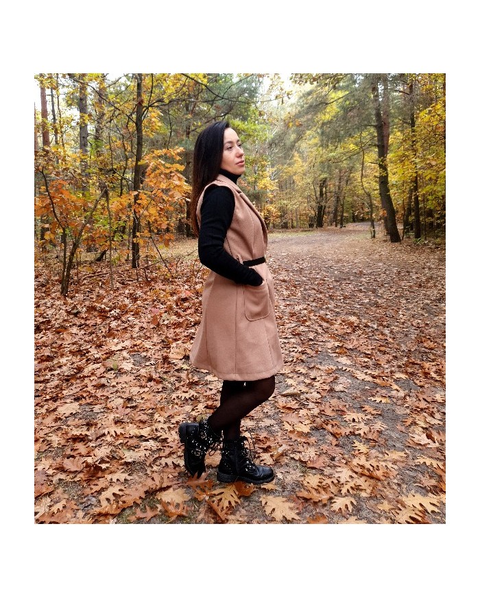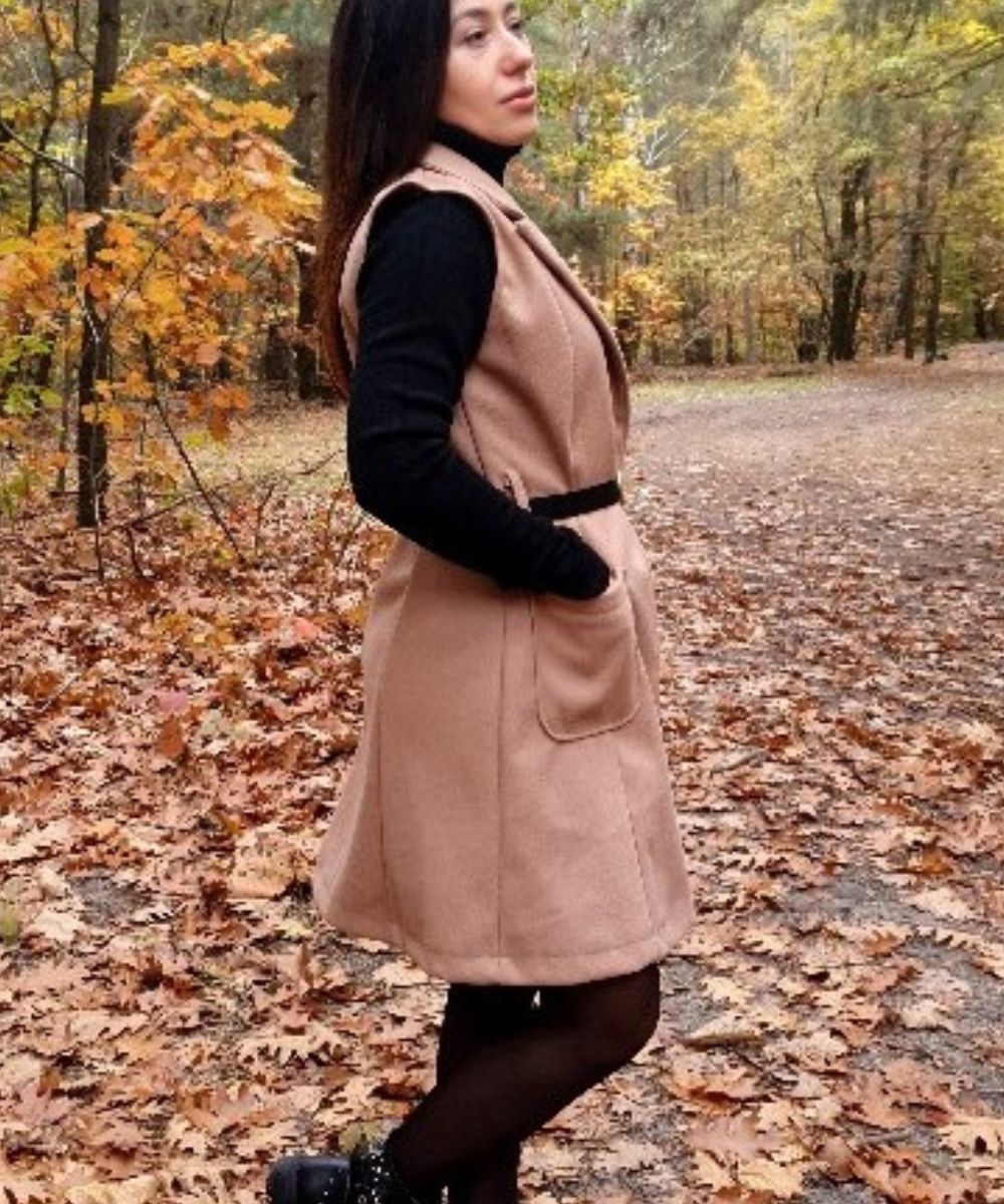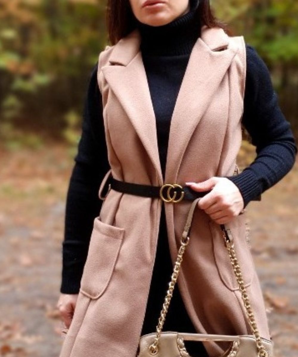 Modna kamizelka , o prostym, wydłużonym fasonie, który sięga mniej więcej przed kolana. Posiada klapy, co nadaje jej elegancki, płaszczowy charakter. Kamizelka ma wpuszczane kieszenie po bokach. W pasie jest przewiązana cienkim, czarnym paskiem ze złotą sprzączką, co podkreśla talię. Jest to uniwersalny element garderoby, idealny jako okrycie wierzchnie na okres przejściowy – wiosnę lub jesień.