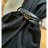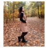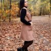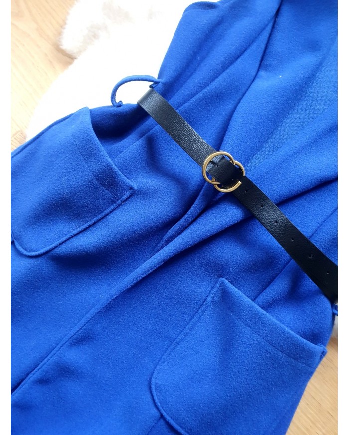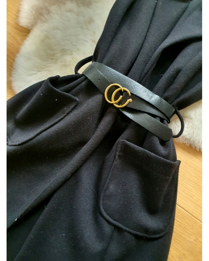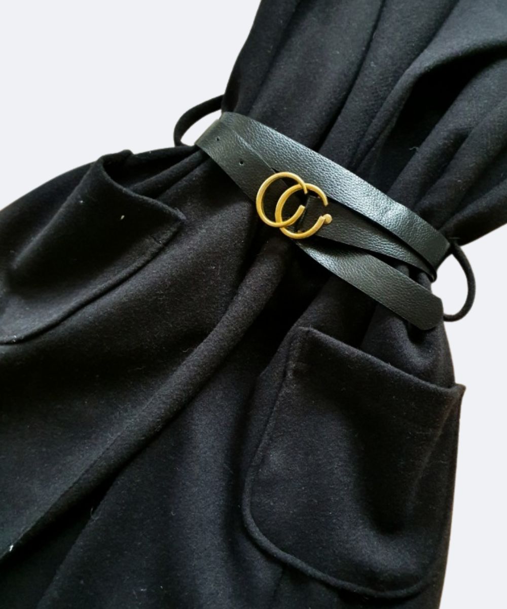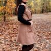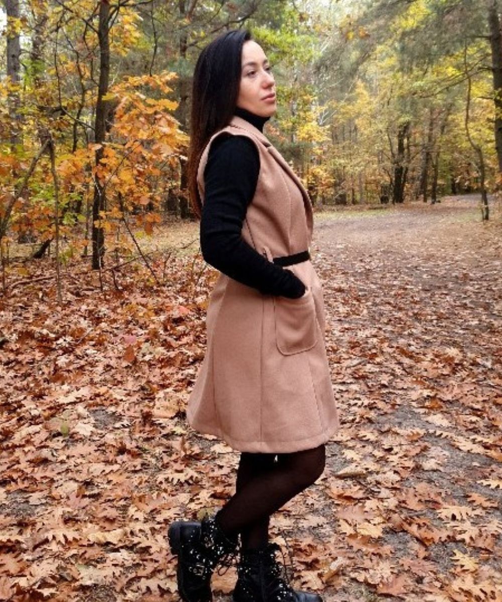 Modna kamizelka , o prostym, wydłużonym fasonie, który sięga mniej więcej przed kolana. Posiada klapy, co nadaje jej elegancki, płaszczowy charakter. Kamizelka ma wpuszczane kieszenie po bokach. W pasie jest przewiązana cienkim, czarnym paskiem ze złotą sprzączką, co podkreśla talię. Jest to uniwersalny element garderoby, idealny jako okrycie wierzchnie na okres przejściowy – wiosnę lub jesień.