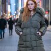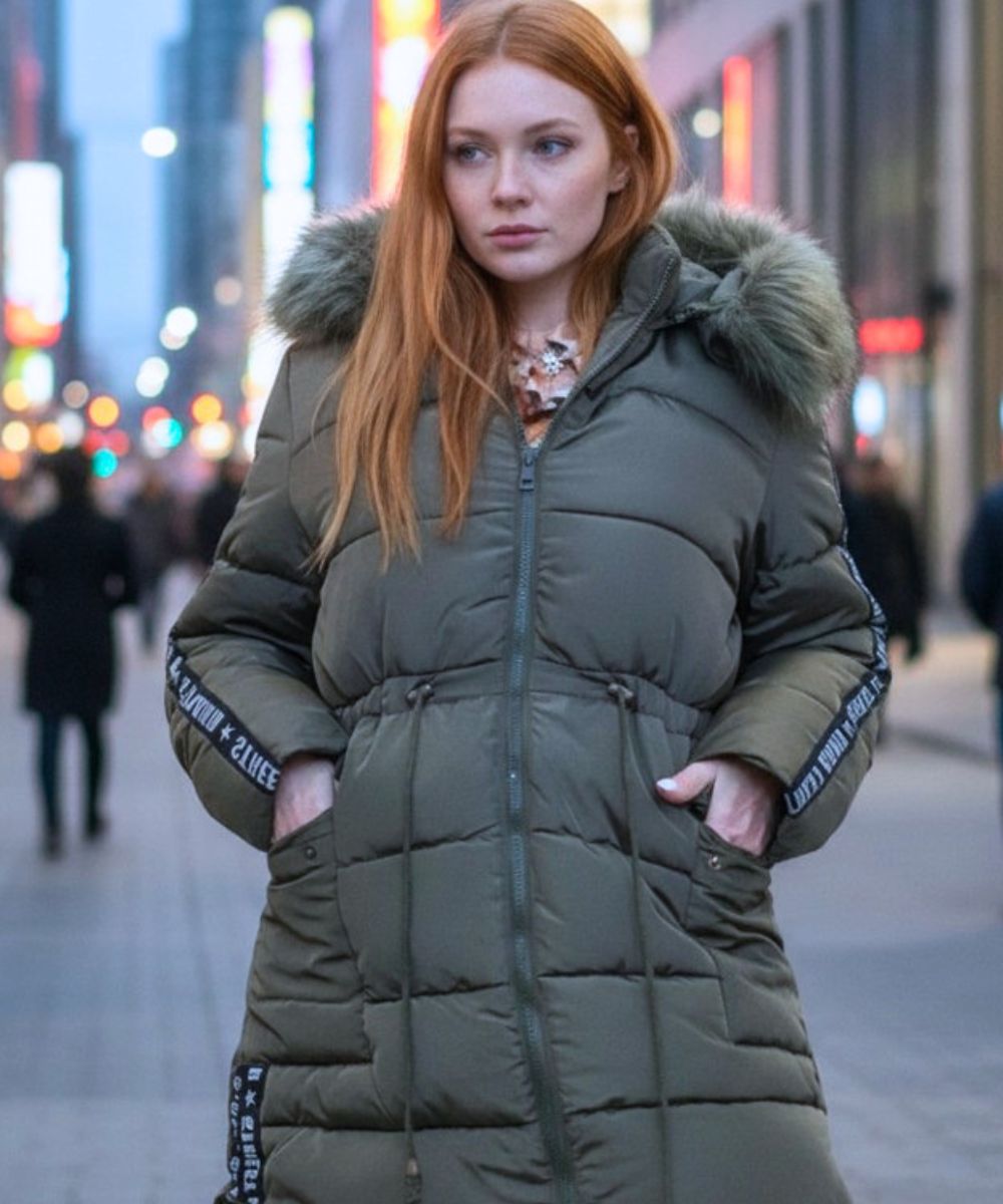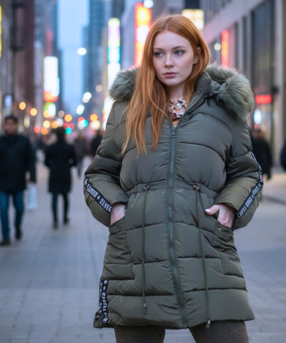 - Kaptur/Kołnierz: Posiada wysoki kołnierz i zintegrowany kaptur, który ma widoczne wykończenie przypominające futro w górnej części.