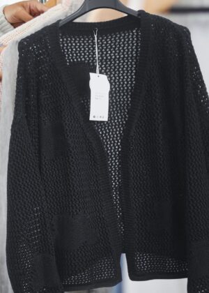 - Fason: Kurtka ma luźny krój, który można dopasować dzięki widocznemu sznurkowi ze stoperami, tworzącemu ściągacz w pasie.