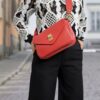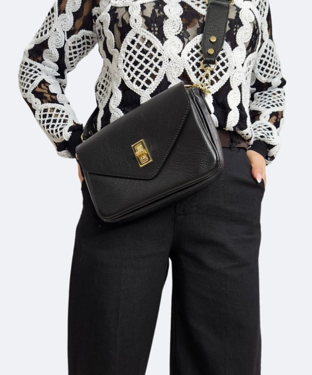 Listonoszka ze skóry naturalnej denaro , z modnym parcianym paseczkiem o regulowanej długości Torebka zapinana jest na klips i zasuwana , Z tyłu torebki i w środku znajdują się kieszonki na zasuwkę oraz jedna na przodzie pod klapką