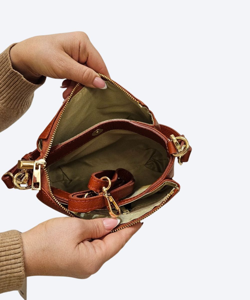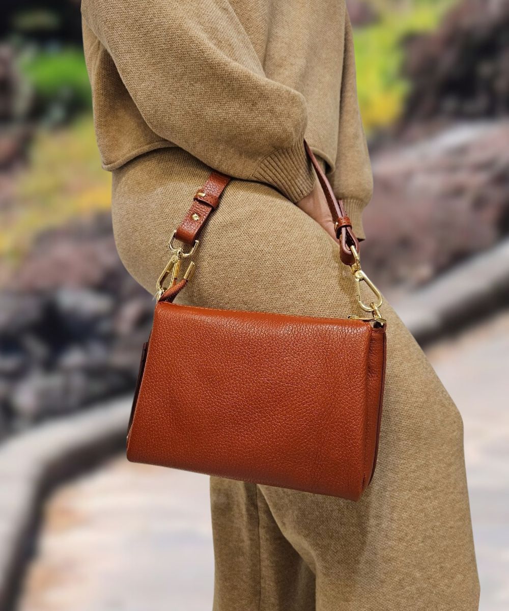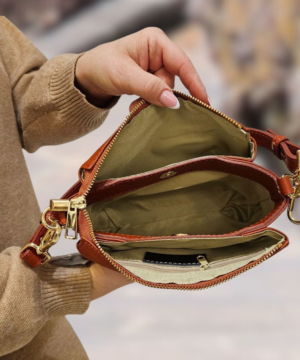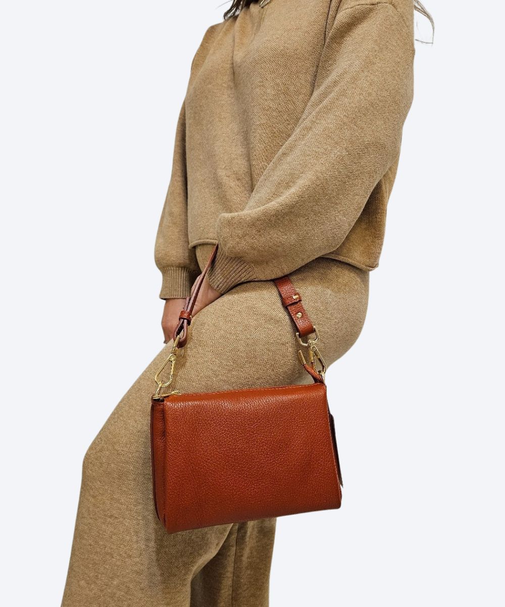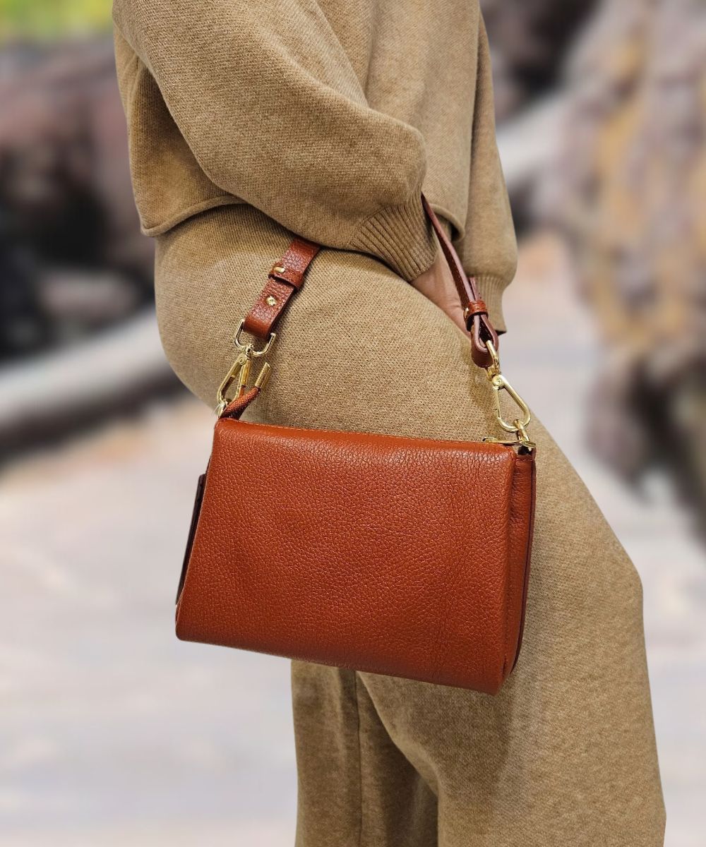 Torebka listonoszka w kolorze ceglastym , wytrzymała i funkcjonalna z trwałością skóry naturalnej oraz luźniejszym, mniej formalnym charakterem sportowego designu zadowoli niemal każdą kobietę , Torebka posiada dopinane ucho , które zawsze możesz odpiąć , zmieniając torebkę na wyjściową , Jej zasobny fason w przegródki ułatwia porządkowanie drobnych przedmiotów , jak kosmetyki , portfel , telefon , torebka posiada tez pasek na ramię .