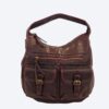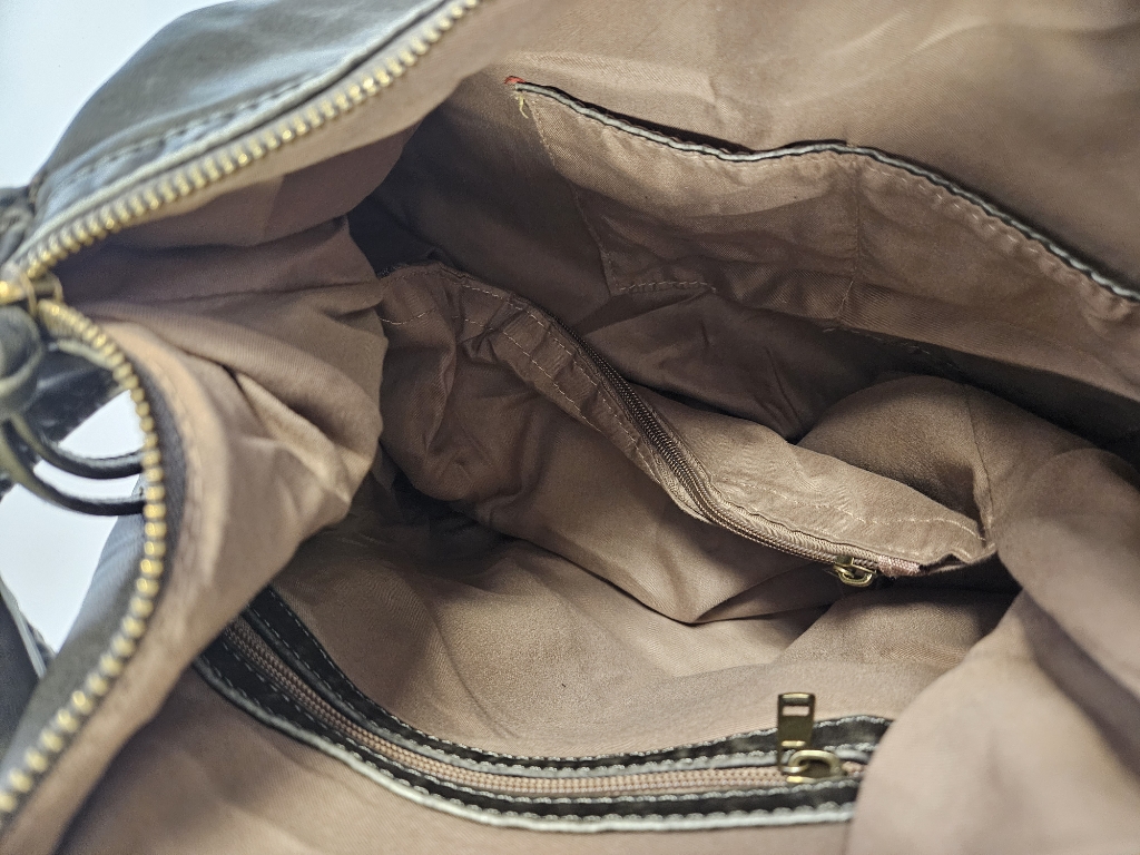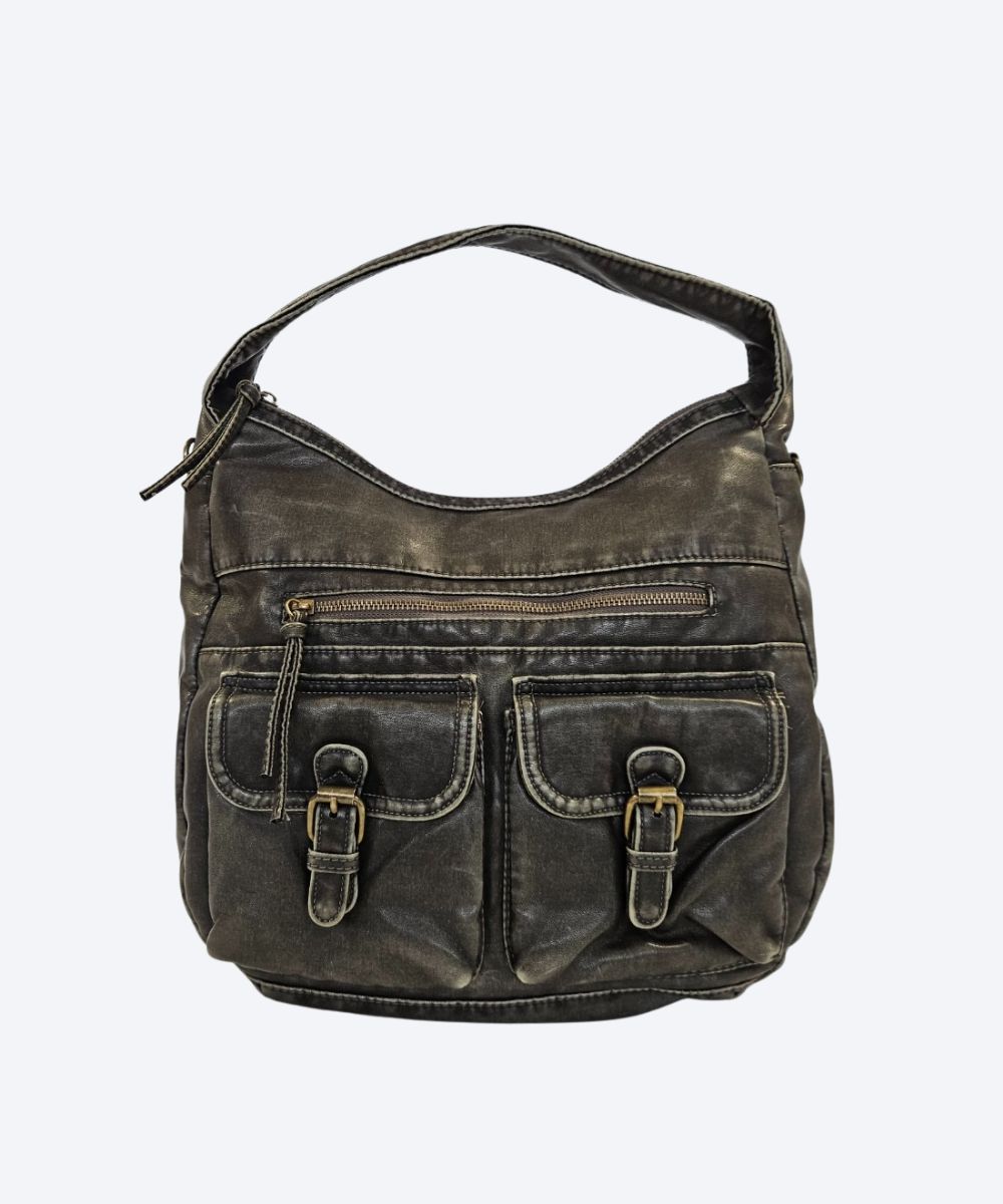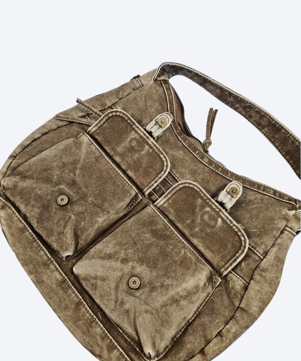 Damska listonoszka sportowa zasuwana na zamek błyskawiczny . Torebka jest wykonana z miękkiego tworzywa o postarzanym, lekko spranym wyglądzie. Ma luźny, workowaty kształt charakterystyczny dla toreb hobo, z pojedynczym paskiem na ramię. Torebka posiada liczne detale, w tym: