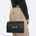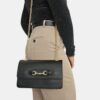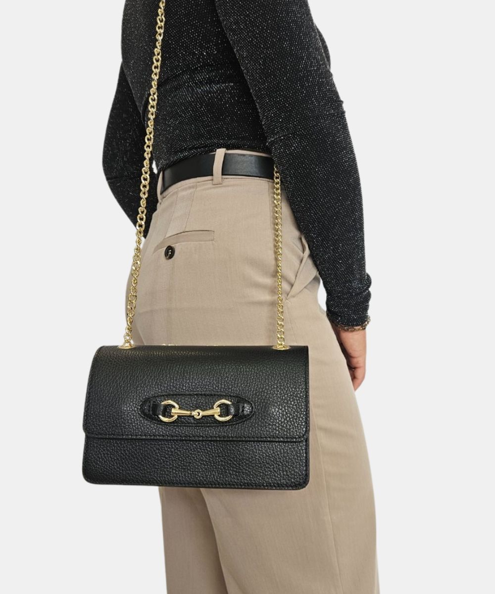 Elegancka torebka z ozdobnym złotym motywem na klapce.