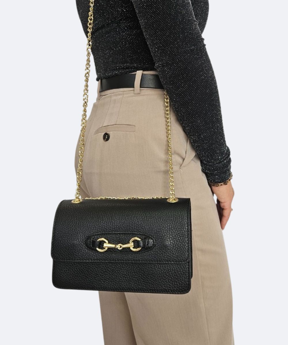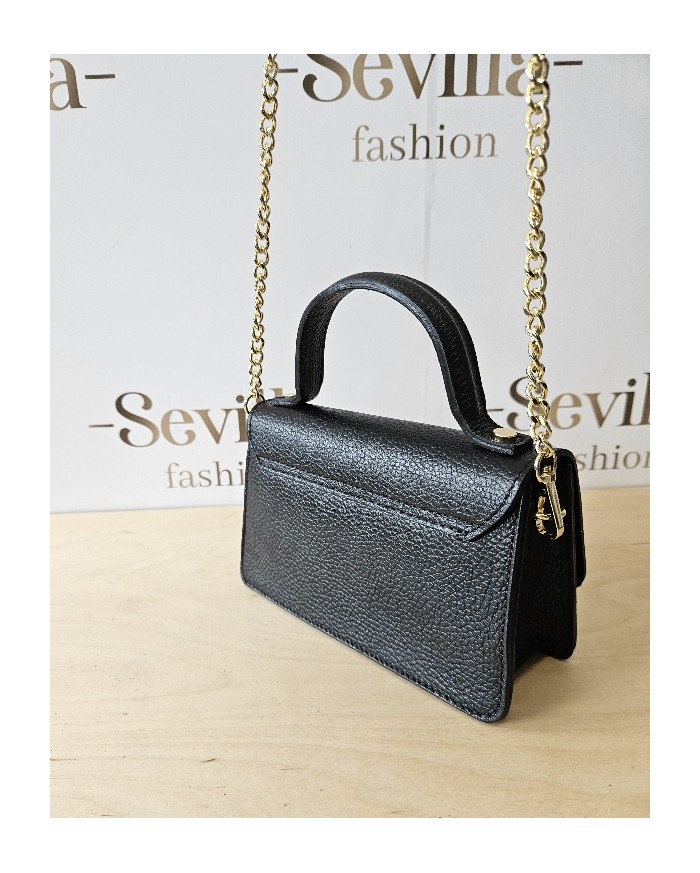Torebka mini czarna – skóra naturalna . Elegancka torebka z ozdobnym złotym motywem na klapce . W środku torebki znajduje się maluśka kieszonka na szminkę . Do torebki dołączony jest łąńcuszek na ramię , który jest dopinany