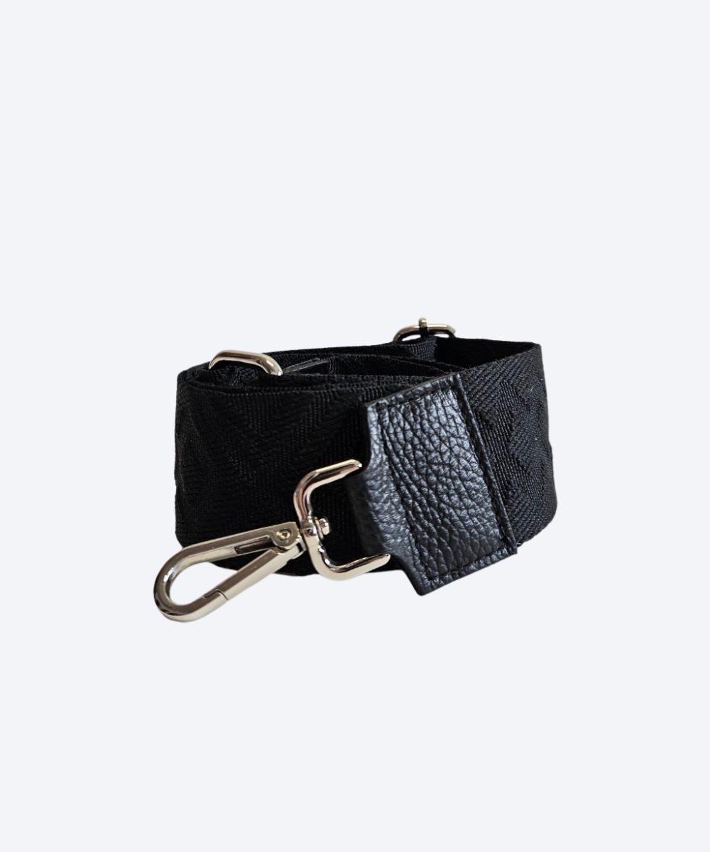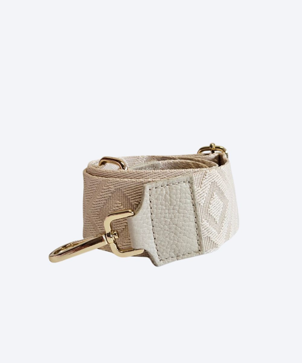 Szeroki pasek do torebki z geometrycznym, tkanym wzorem, Wykonany z wytrzymałego materiału tekstylnego, wykończony z fakturowanej skóry ekologicznej. Pasek posiada solidne, srebrne karabińczyki umożliwiające łatwe przypięcie do torebki. Stylowy i nowoczesny dodatek, który nada charakteru każdej torbie. łączy w sobie funkcjonalność z estetyką stylu boho.
