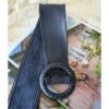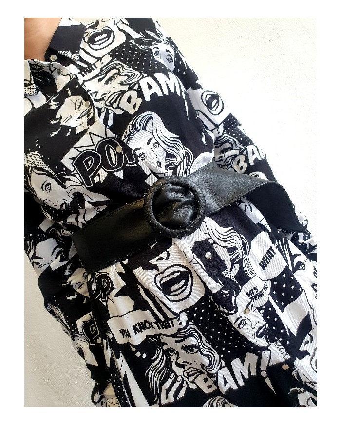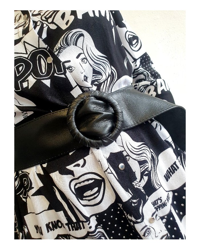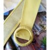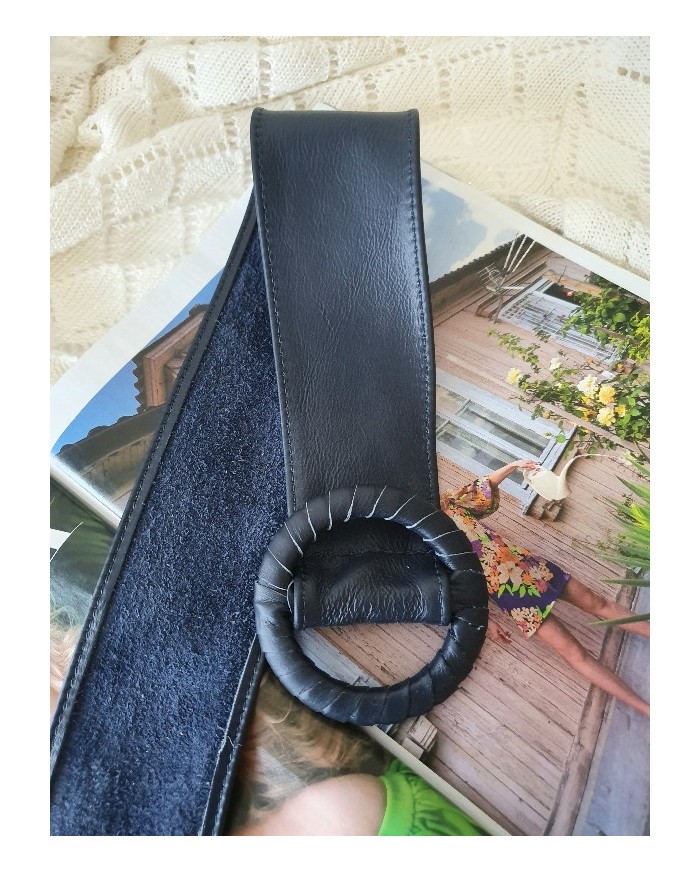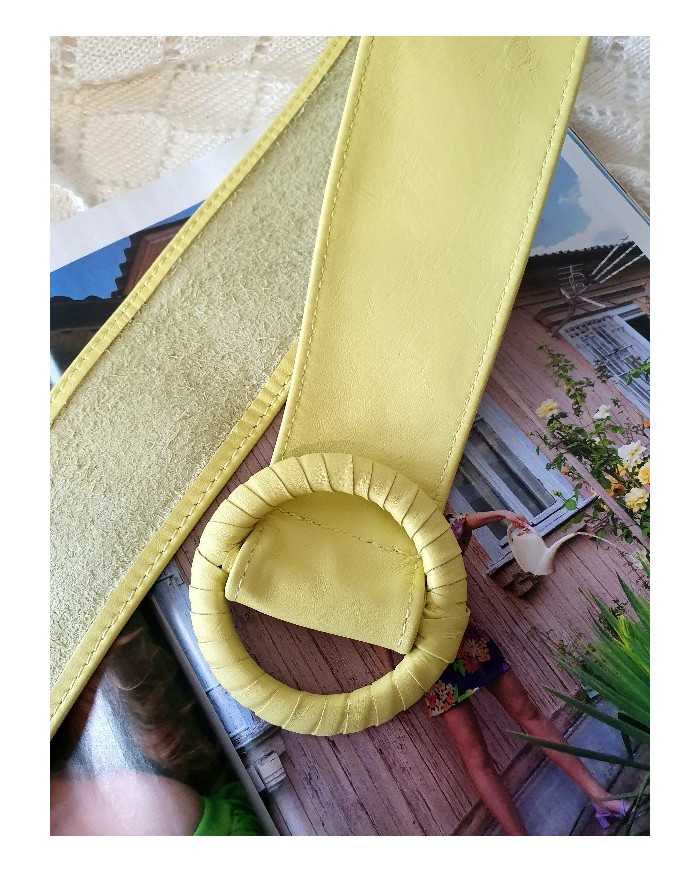 Pasek wykonany ze skóry naturalnej. Strona wierzchnia ma gładkie wykończenie, natomiast spodnia strona (widoczna po lewej) wykonana z zamszu .Pasek posiada dużą, okrągłą klamrę. Klamra jest w tym samym kolorze co pasek i ma teksturowaną, owiniętą strukturę.