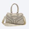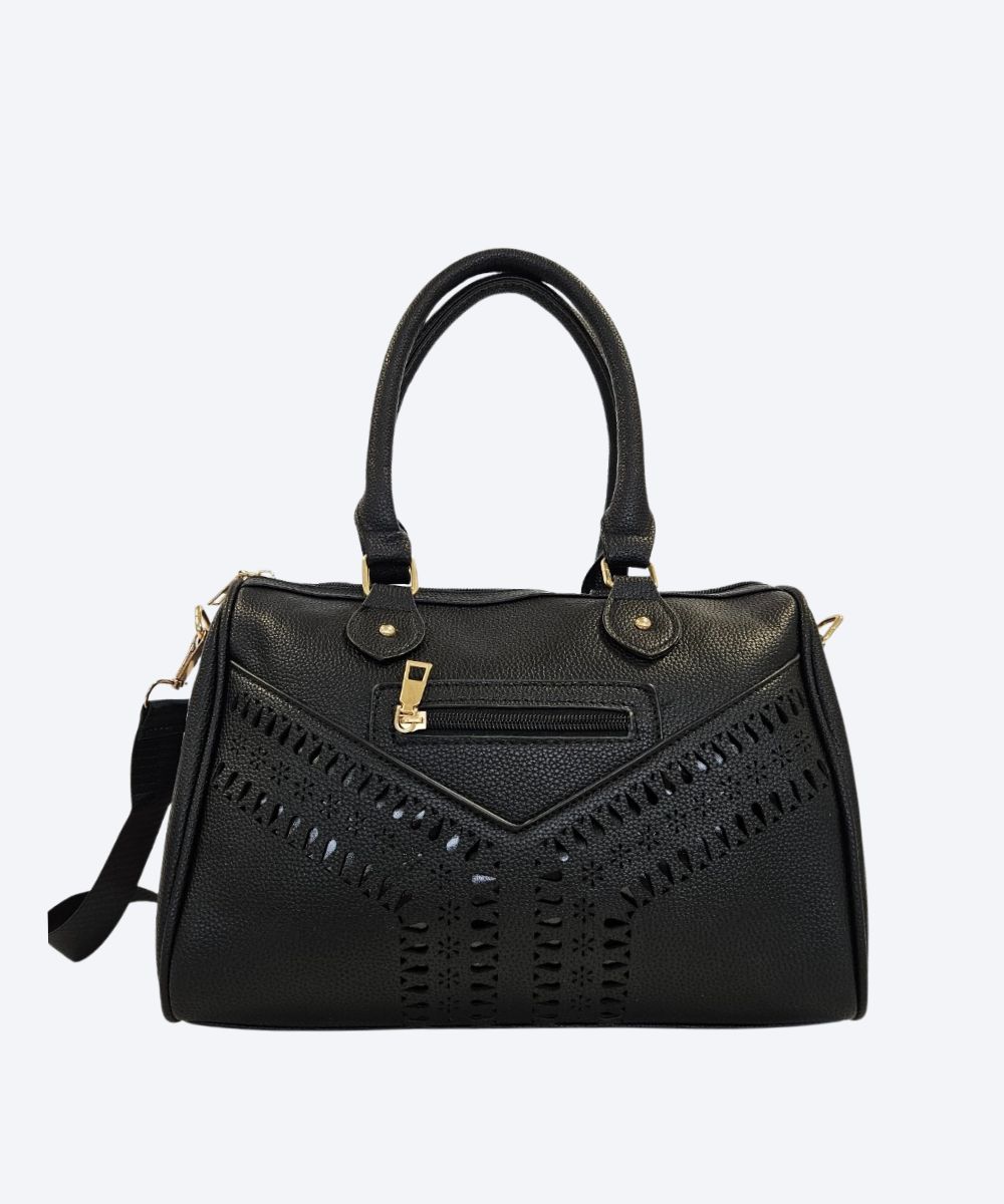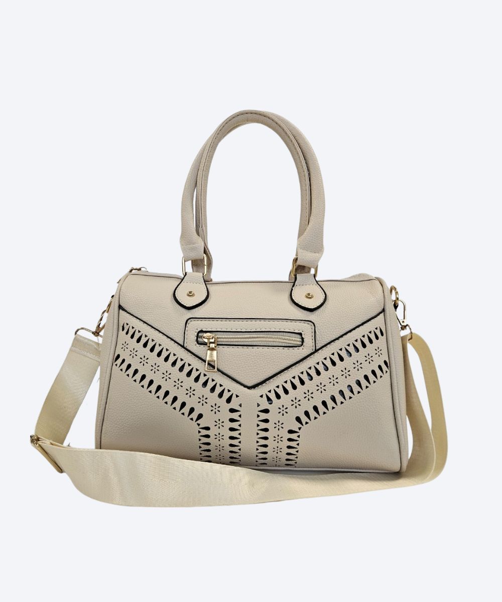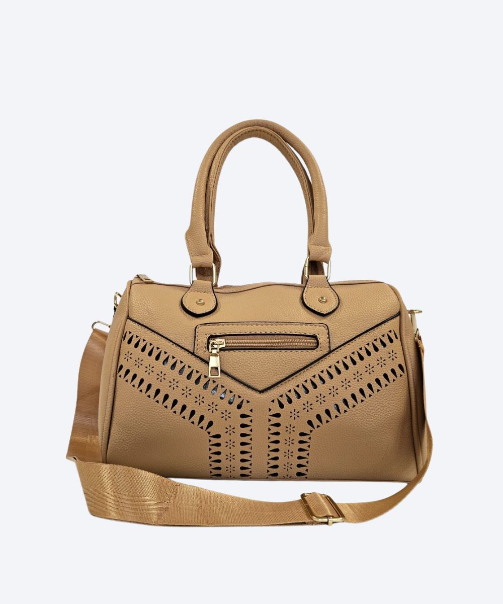 Damska torebka kuferek która łączy elegancje z praktycznością .Charakteryzuje się nowoczesnym wzornictwem, które sprawdzi się zarówno w codziennych stylizacjach, jak i na bardziej formalne okazji . Front torebki ozdobiony jest unikalnymi, laserowo wycinanymi ażurowymi wzorami, które układają się w geometryczne linie, nadając jej lekkości i modnego charakteru .Model wykonany w uniwersalnym kolorze beżowym (cappuccino/camel),czarny uzupełniony o eleganckie złote okucia i detale, takie jak zamki błyskawiczne.