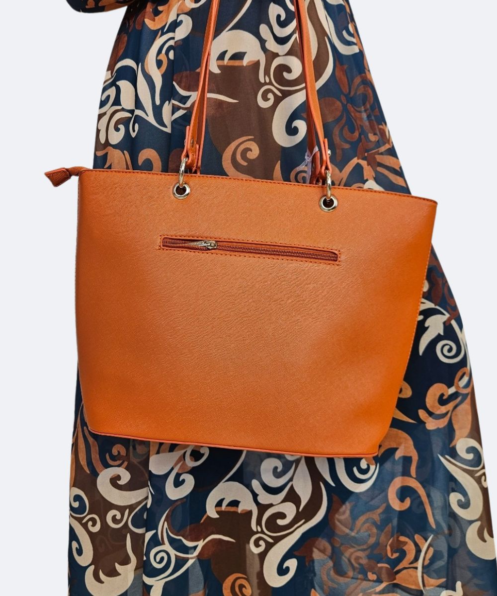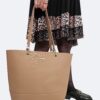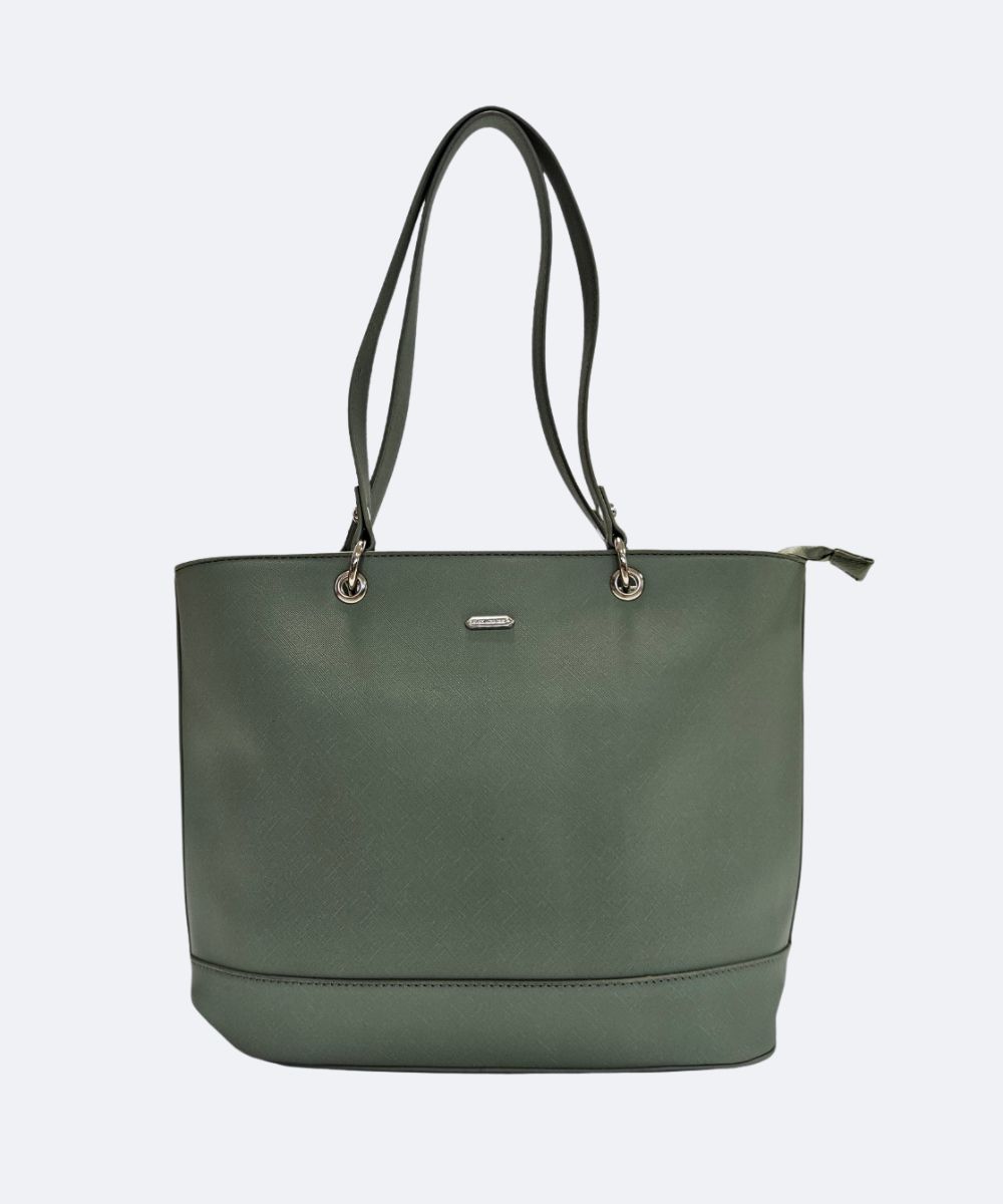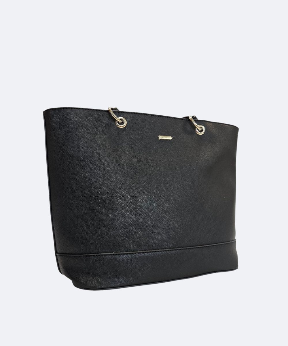 Duża torebka na ramię David Jones z mocnej skóry syntetycznej. Z przodu znajduje się srebrne logo David Jones. Torebka zapinana na zamek, wnętrze nie jest dzielone, w podszewce jedna otwarta kieszeń i jedna kieszeń na suwak. Torebka mieści format A4.