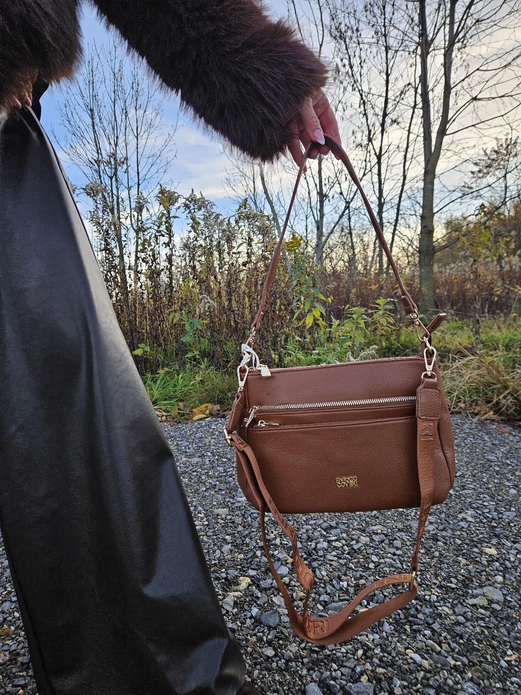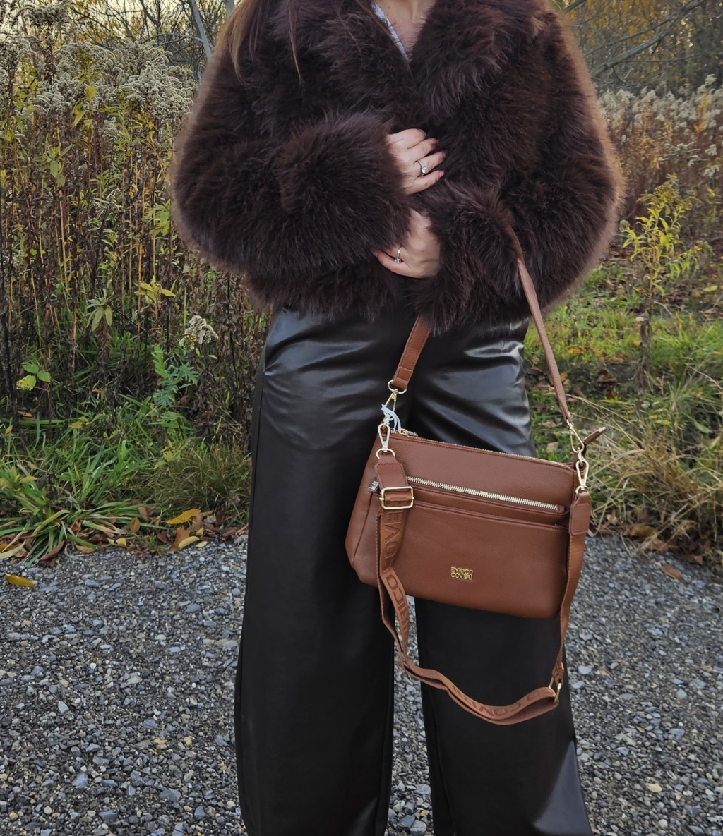Praktyczna, średniej wielkości torebka z dwiema kieszeniami chowanymi na zamek na drobiazgi, umieszczonymi na przodzie. Torebka posiada parciany pasek regulowany dopinany