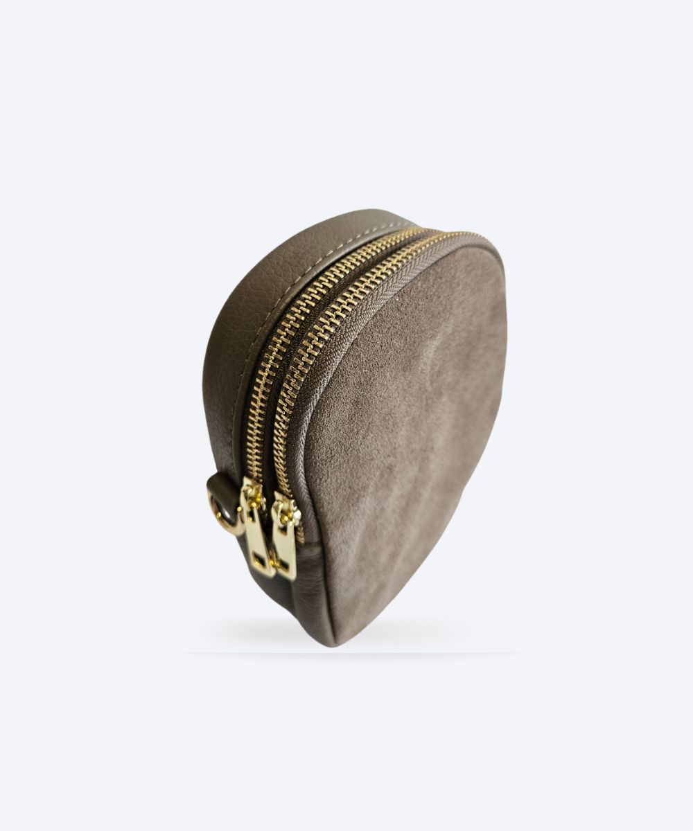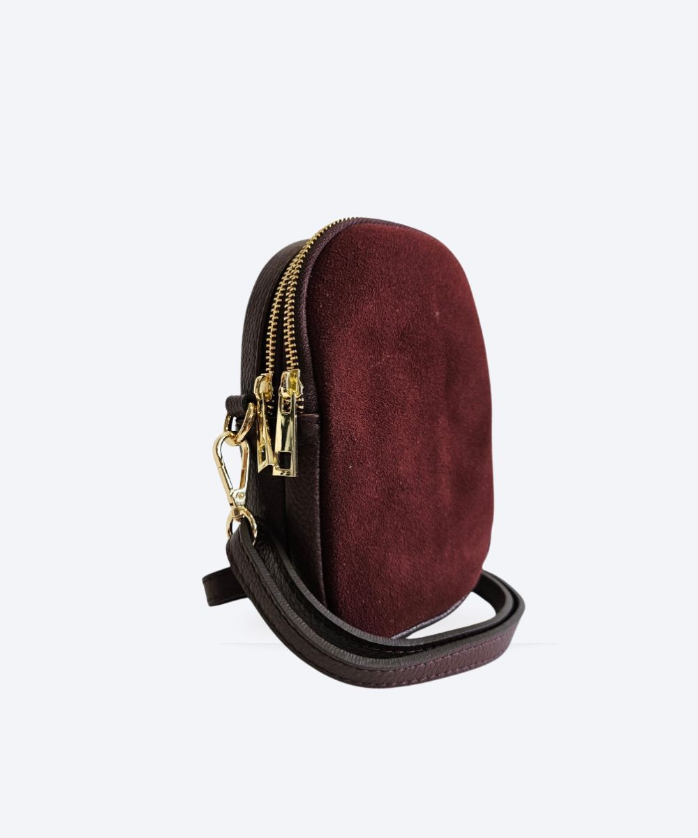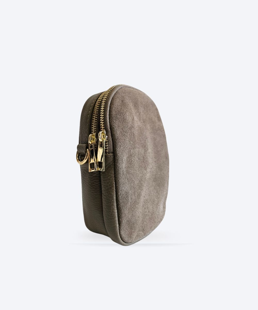Mała, damska torebka typu listonoszka (kuferek) wykonana z połączenia skóry naturalnej i zamszu. Charakteryzuje się ona półokrągłym kształtem oraz złotymi okuciami .