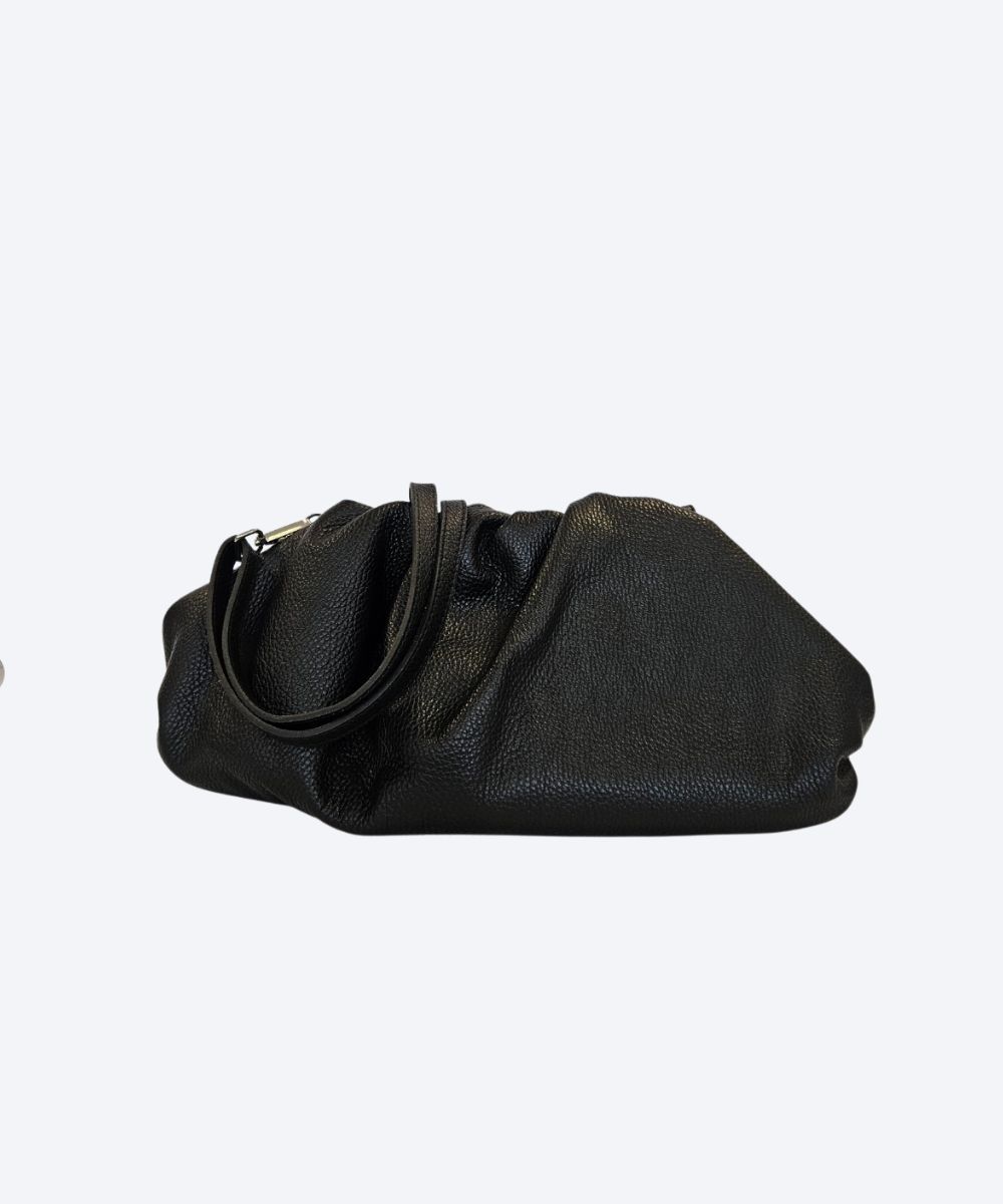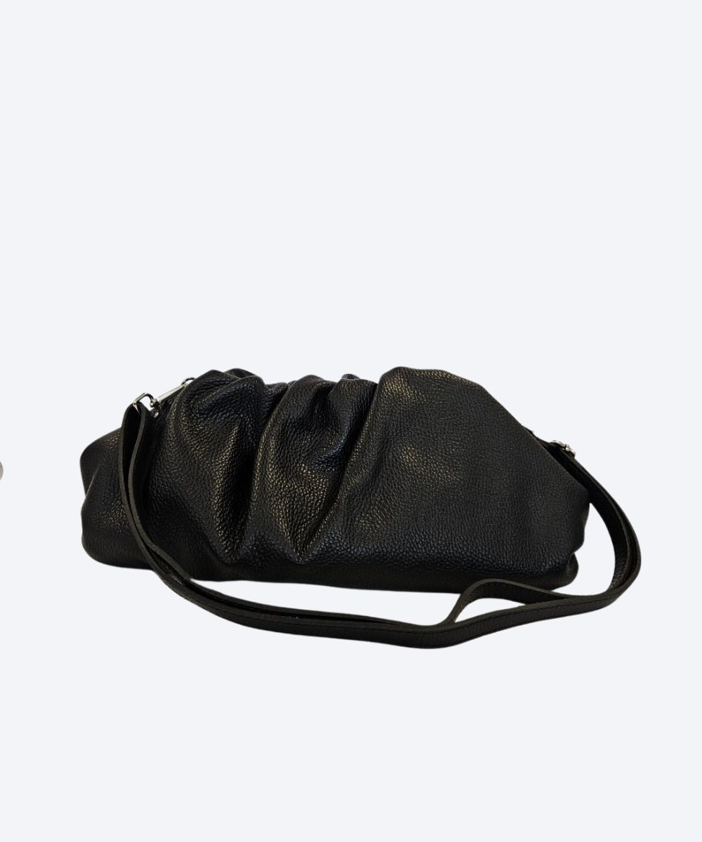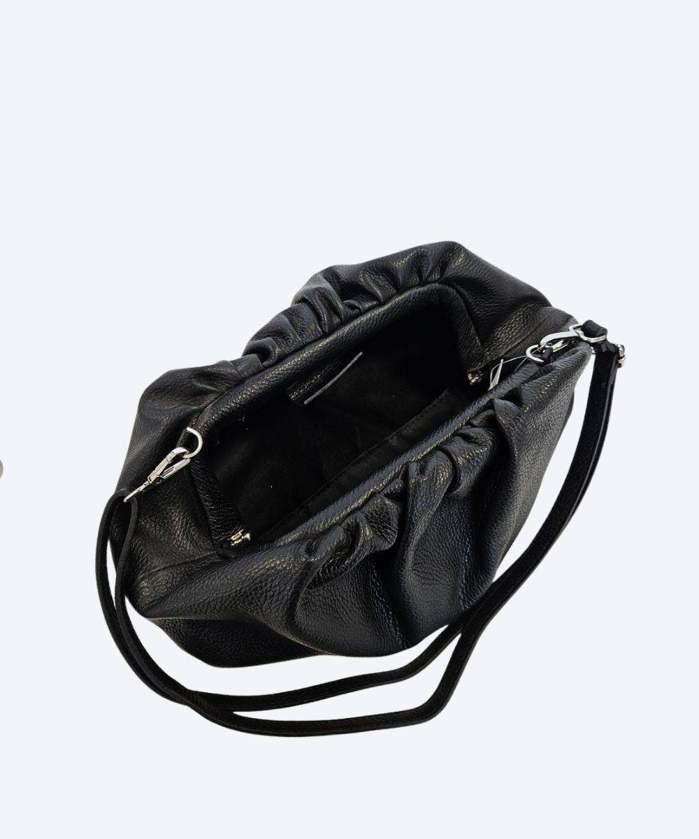 Modna torebka ze skóry naturalnej z marszczeniem przy zamknięciu . Torebka zamyka się na magnesy umieszczone koło zmarszczeń . Do torebki dołączony jest pasek odpinany .