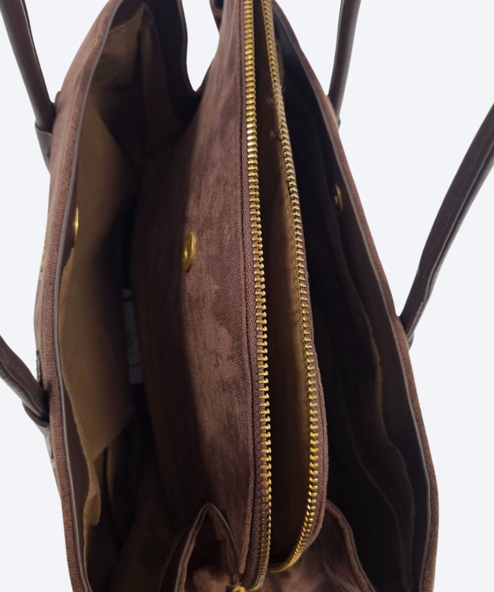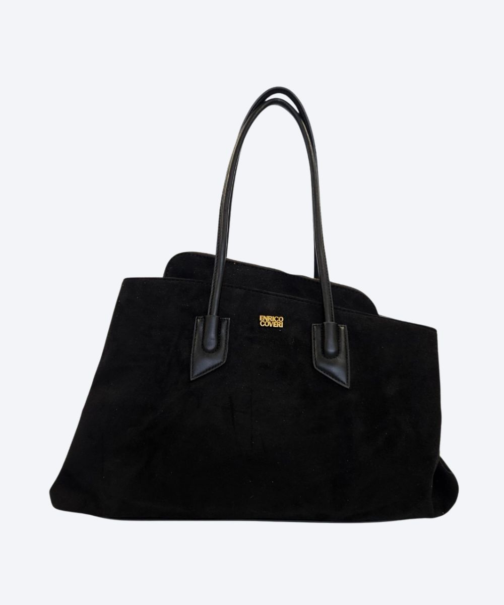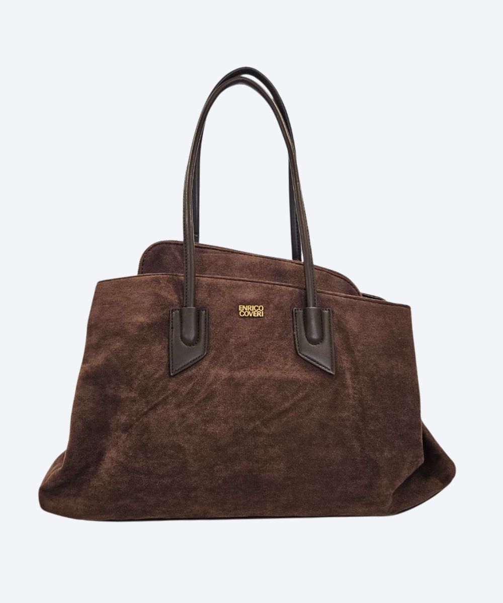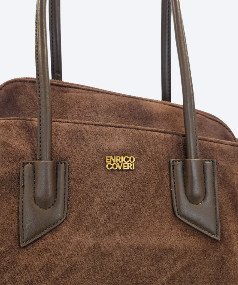 Damska torebka typu shopper marki Enrico Coveri ,wykonaną z zamszu . Jest to duża torba z otwartą górą. Posiada dwie solidne, długie rączki w ciemniejszym, skóropodobnym odcieniu, umożliwiające noszenie jej na ramieniu lub w dłoni.