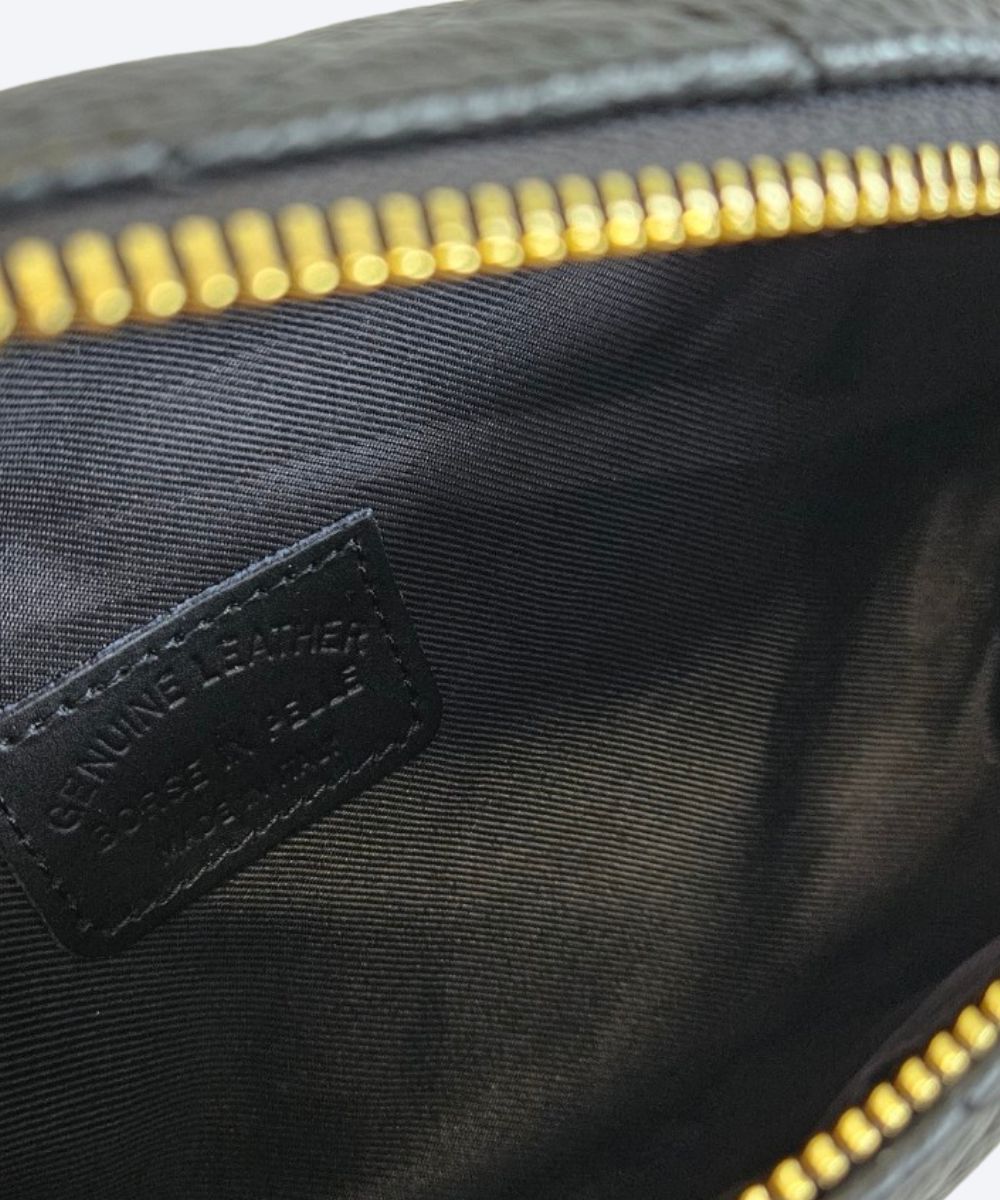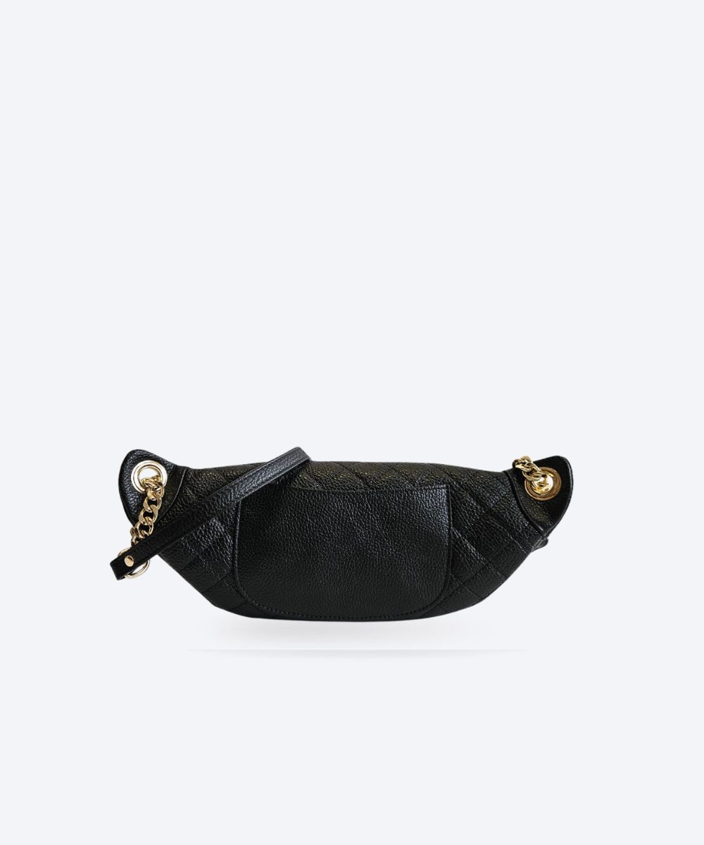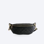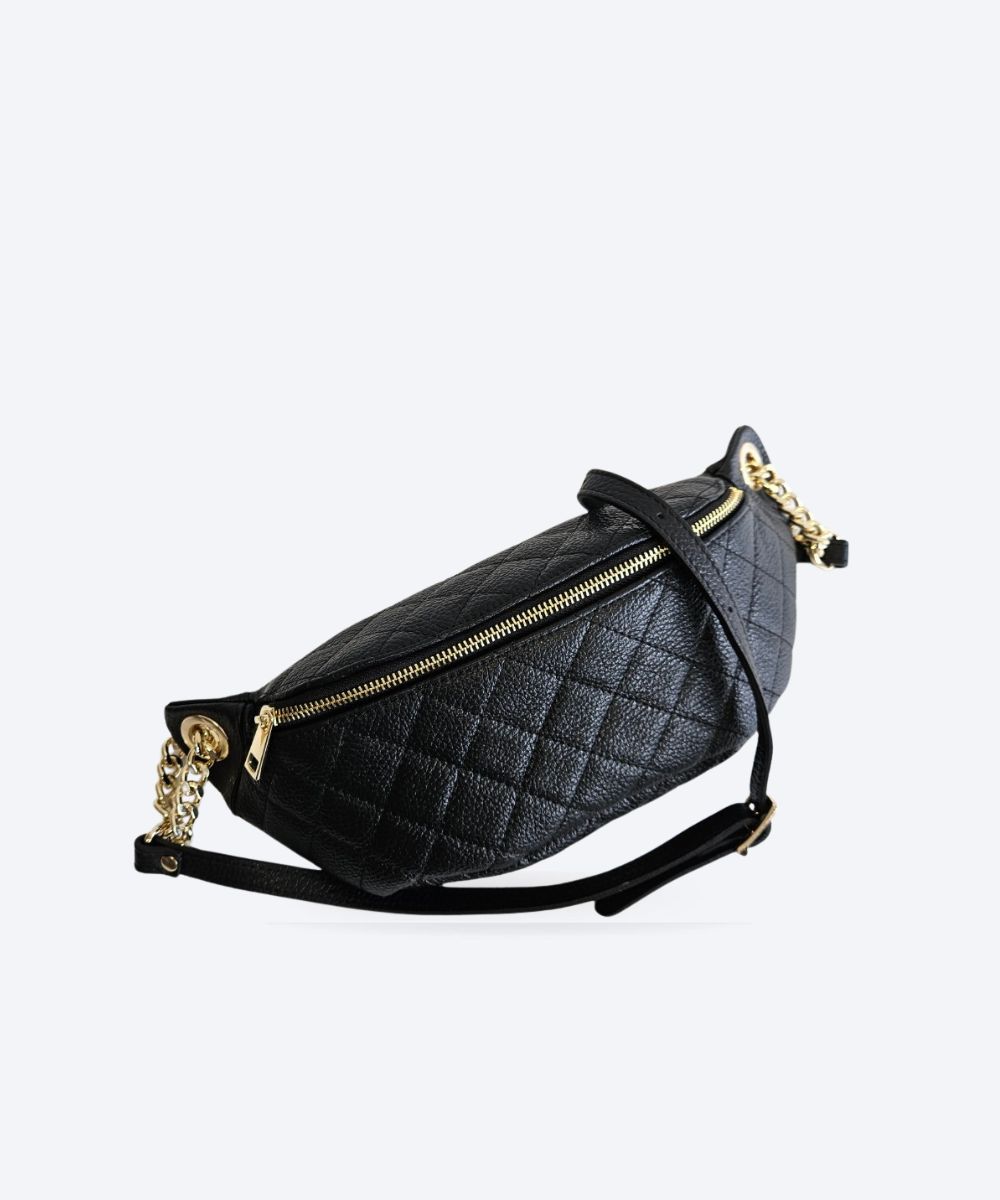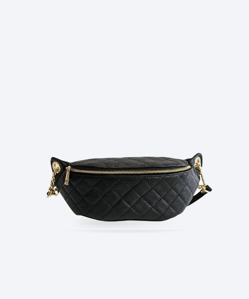 Pikowana nerka damska, która może służyć jako saszetka na biodra lub torebka typu crossbody. Model ten charakteryzuje się wzorem w romby oraz eleganckimi, złotymi okuciami i zamkiem błyskawicznym.
