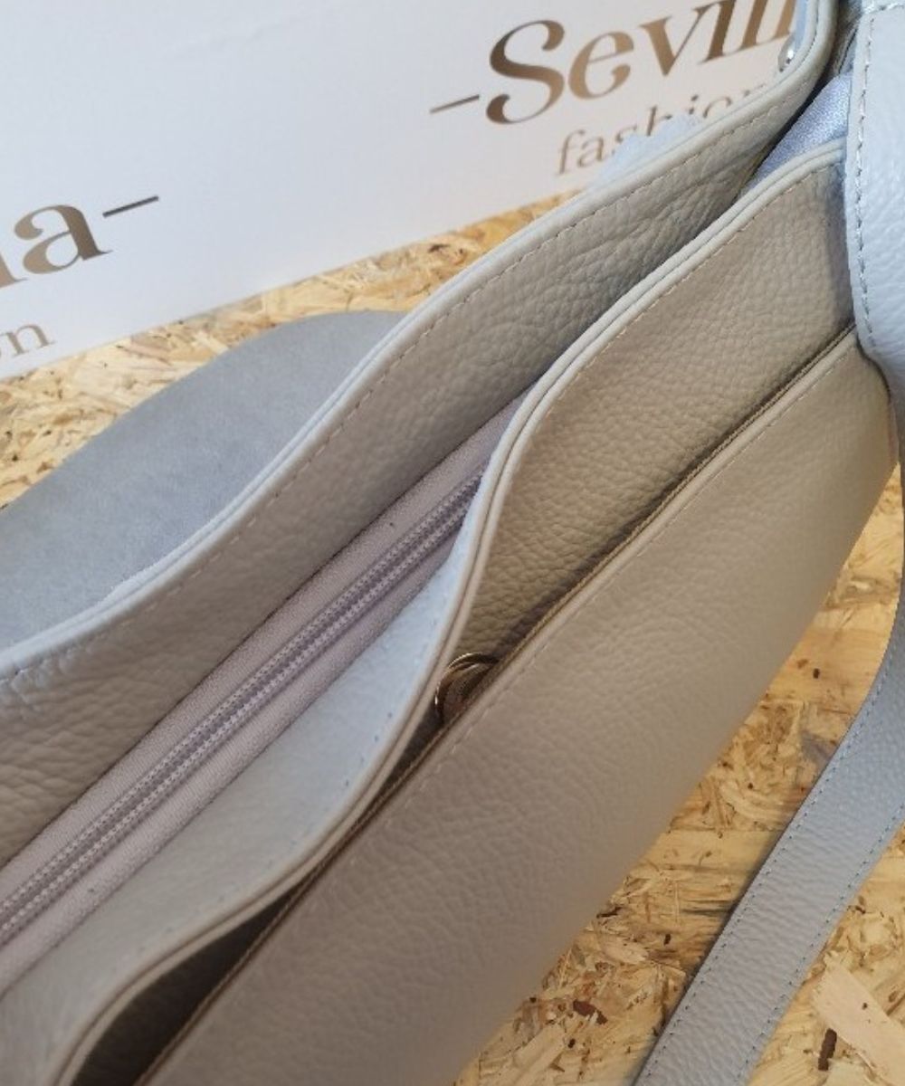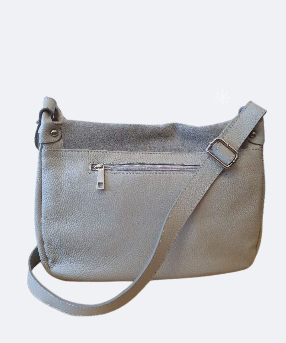 Torebka skórzana z włoskiej kolekcji , model na regulowanym pasku . Listonosza z zamszową klapką . Na przodzie torebki znajduje się duza kieszen na potrzebne rzeczy jak telefon , klucze , bilet . Z tyłu torebki doszyta jest kieszeń na zamek . Torebka w środku jest dość pakowna , możesz umieśc w niej książki , dokumenty , kosmetyczke , posiada tez na śćiance bocznej doszyta kieszonke na zasówkę . Torebka jest w kolorze popielu