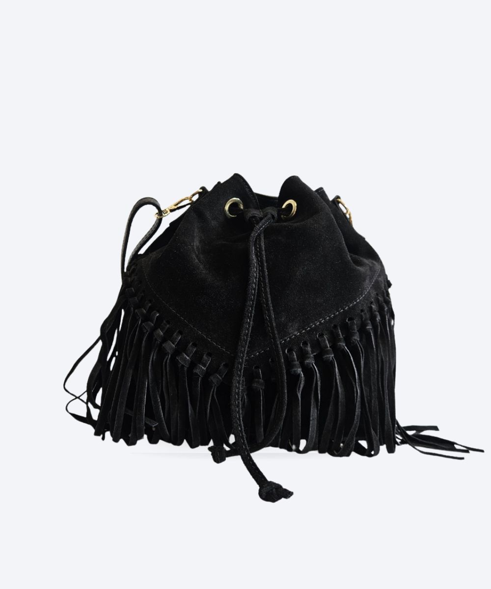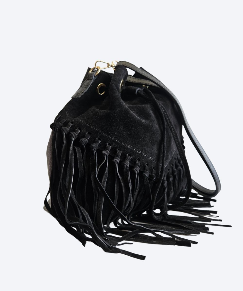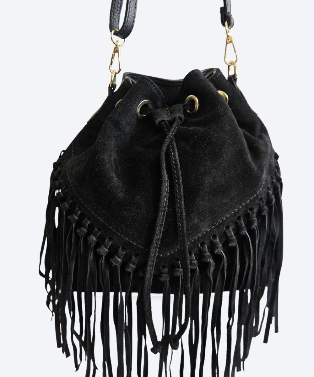 Torebka to model typu worek w stylu boho, wykonany z wysokiej jakości skóry zamszowej. Charakteryzuje się ona ozdobnymi frędzlami, które nadają jej unikalny, swobodny charakter . Zazwyczaj posiada jedną główną komorę zamykaną na metalowy suwak oraz dodatkową wewnętrzną kieszonkę na drobiazgi .