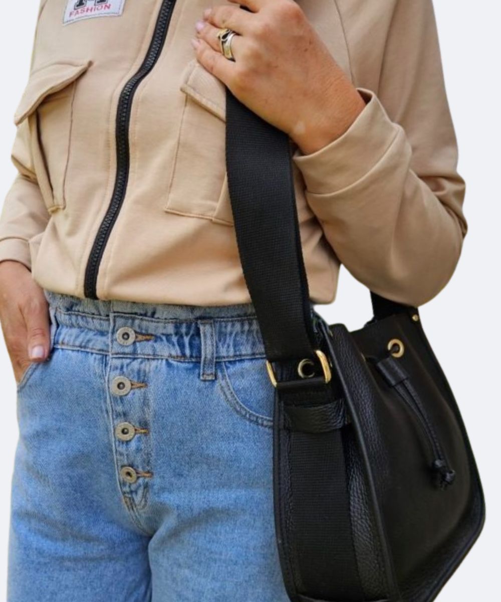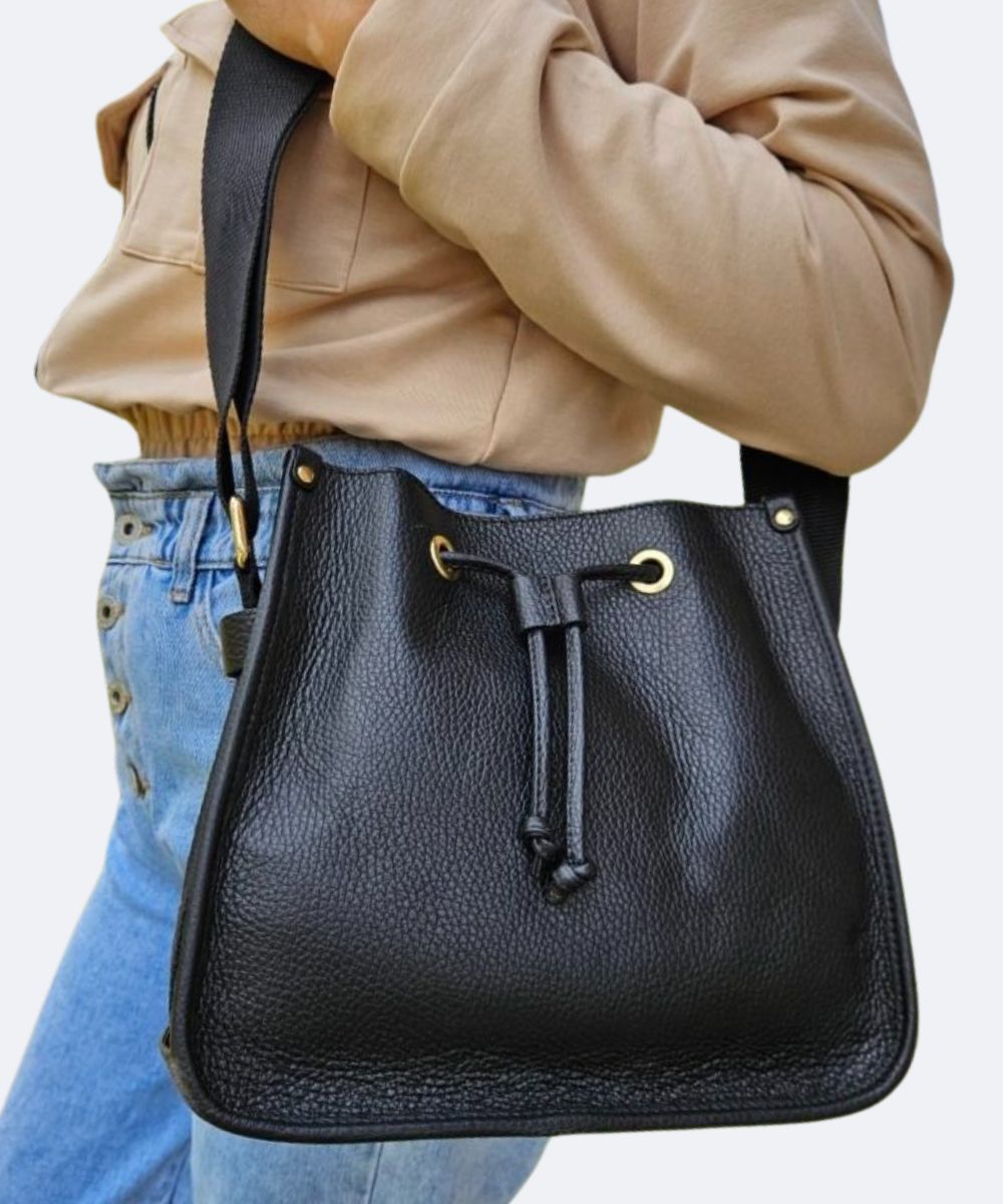 Torebka skórzana usztywniana , jest ściągana na sznureczku na złotych kółeczkach ,. Do torebki zrobiono , regulowany parciany pasek na złotych koluszkach .