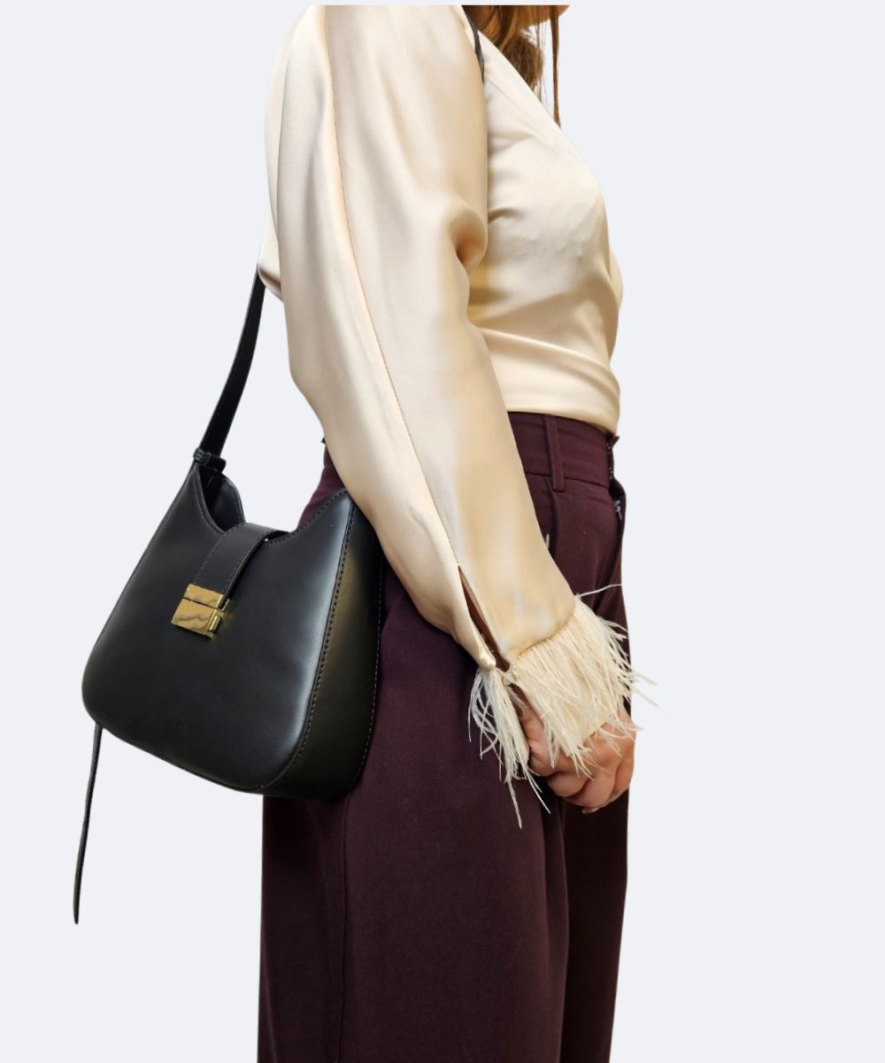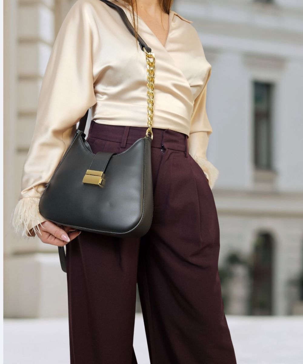 Torebka klasyczna ze skóry naturalnej, ma prosty, elegancki fason ,o lekko usztywnionej formie, która zachowuje kształt nawet kiedy włożysz do niej rzeczy .Torebka posiada pasek na ramie połączony ze złotym łancuszkiem.