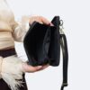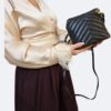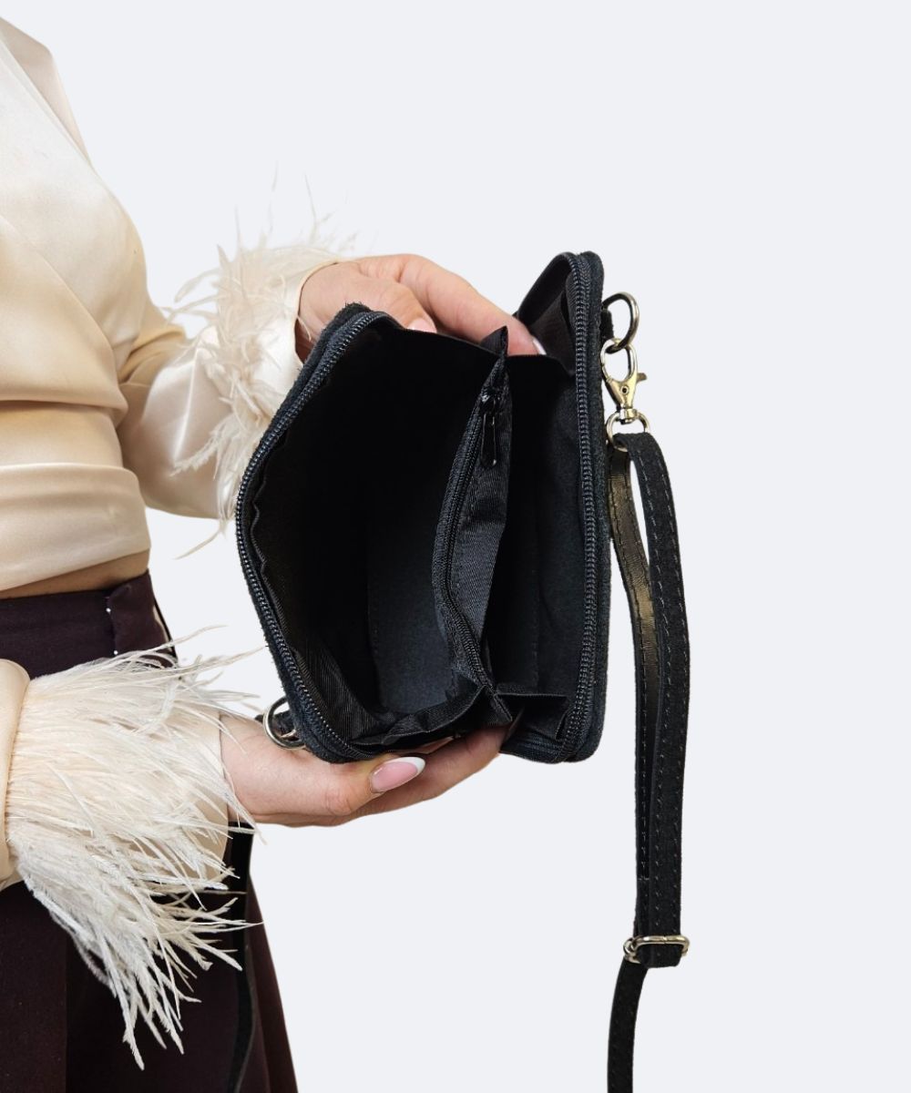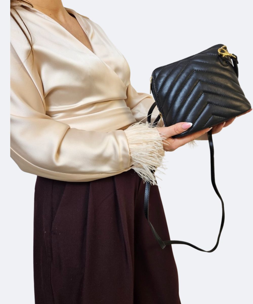 Mała czarna torebka , wykonana ze skóry naturalnej . Torebka jest pikowana w modne ukosne pasy i posiada odpinany pasek na ramię .