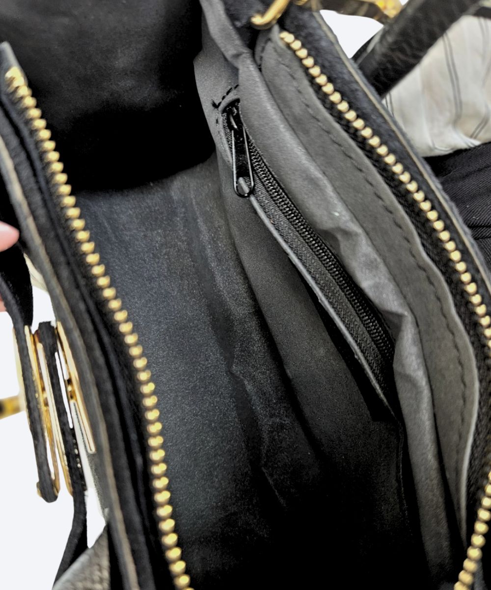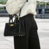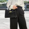 - Kolorystyka i detale: Torebka jest w kolorze głębokiej czerni, którą dopełniają luksusowe akcenty w kolorze złotym, takie jak charakterystyczne zapięcie na środku oraz metalowe nóżki chroniące spód