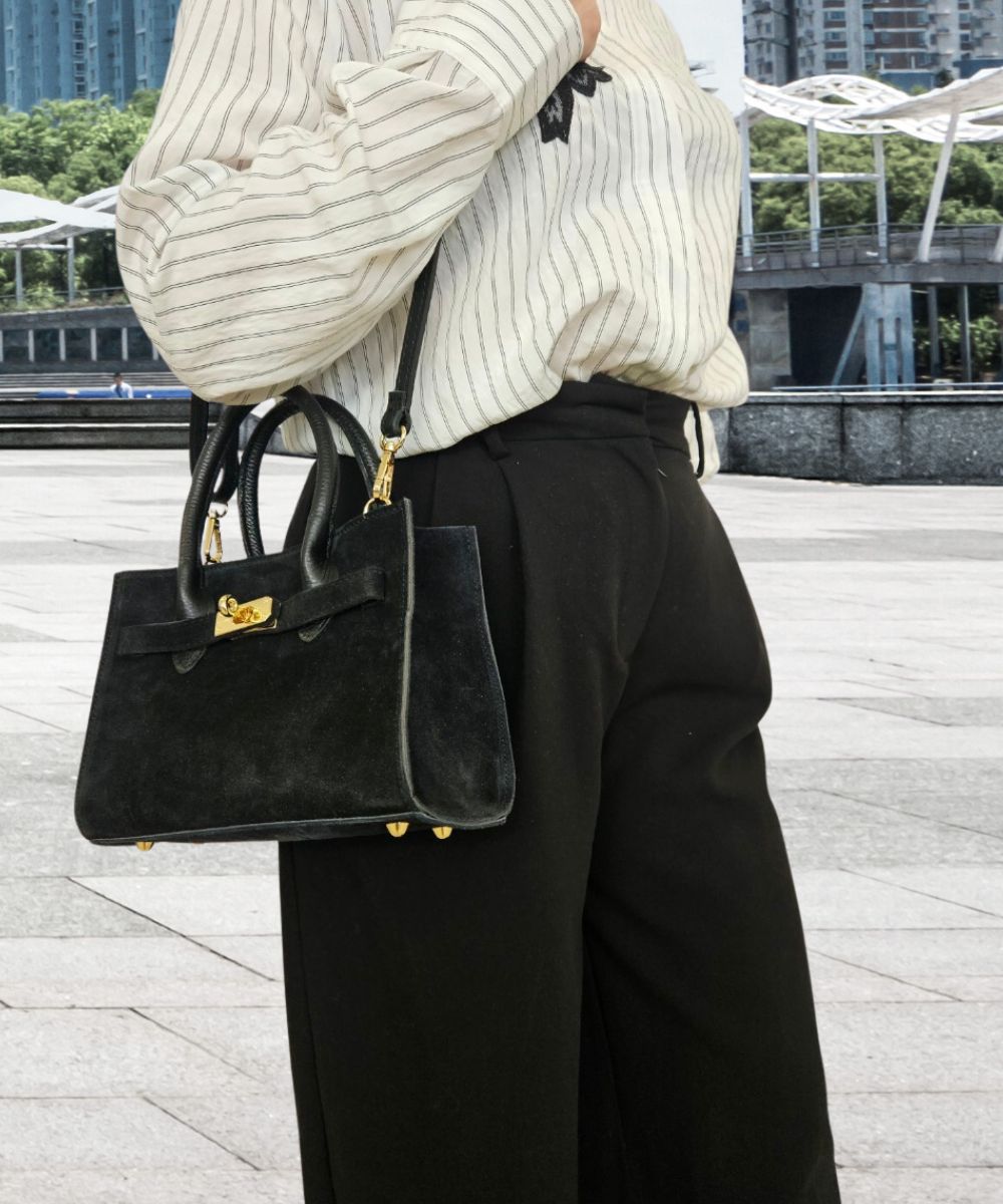 - Wykonana w 100% z naturalnej skóry zamszowej naturalnej, która nadaje jej miękką strukturę i matowe wykończenie.