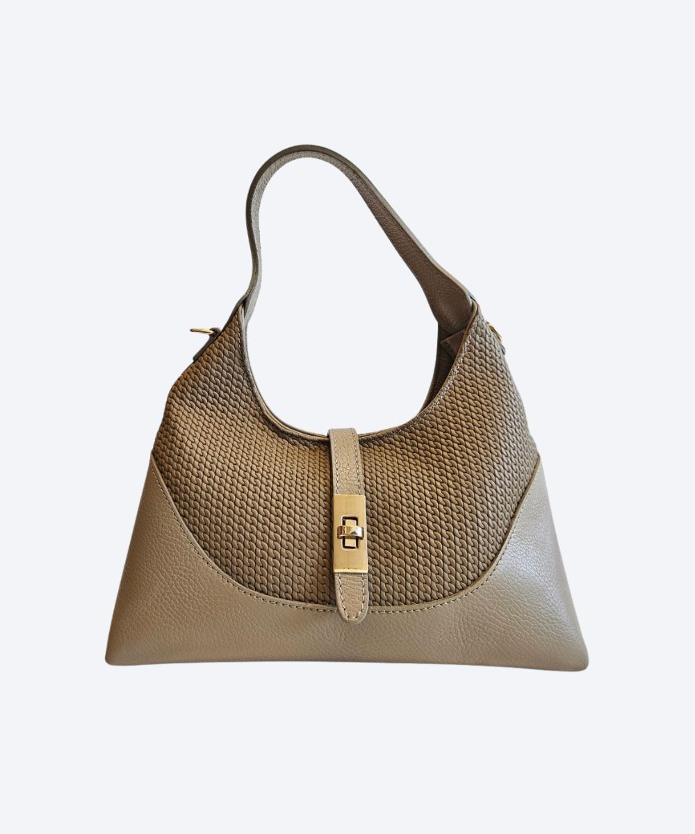 Damska torebka to model łączący elegancką, gładką skórę z charakterystycznym, strukturalnym panelem o splocie przypominającym rafię lub plecionkę. Posiada krótki uchwyt do ręki oraz długi, regulowany i odpinany pasek umożliwiający noszenie jej jako listonoszkę (crossbody). Detalami w torebce są złote okucia, wewnętrzna kieszeń na zamek oraz podszewka.