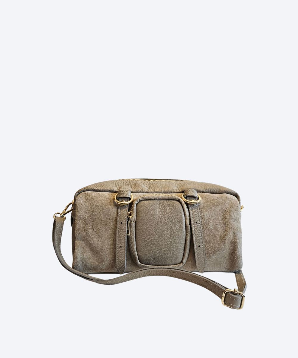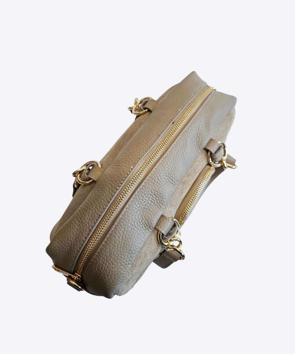 Stylowa torebka, model typu kuferek (często określany też jako “jamnik” ze względu na swój podłużny kształt), wykonany z połączenia naturalnej skóry licowej oraz zamszu. Charakterystycznym elementem są zewnętrzne kieszonki na suwak oraz złote okucia, które nadają jej elegancki, włoski styl