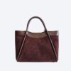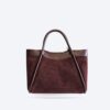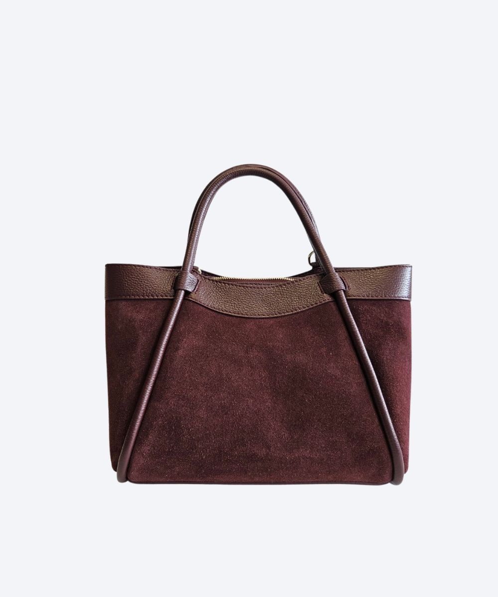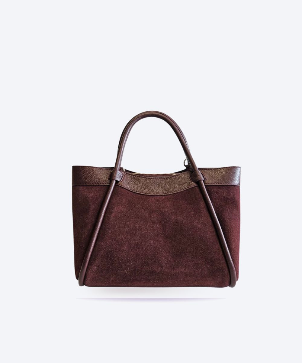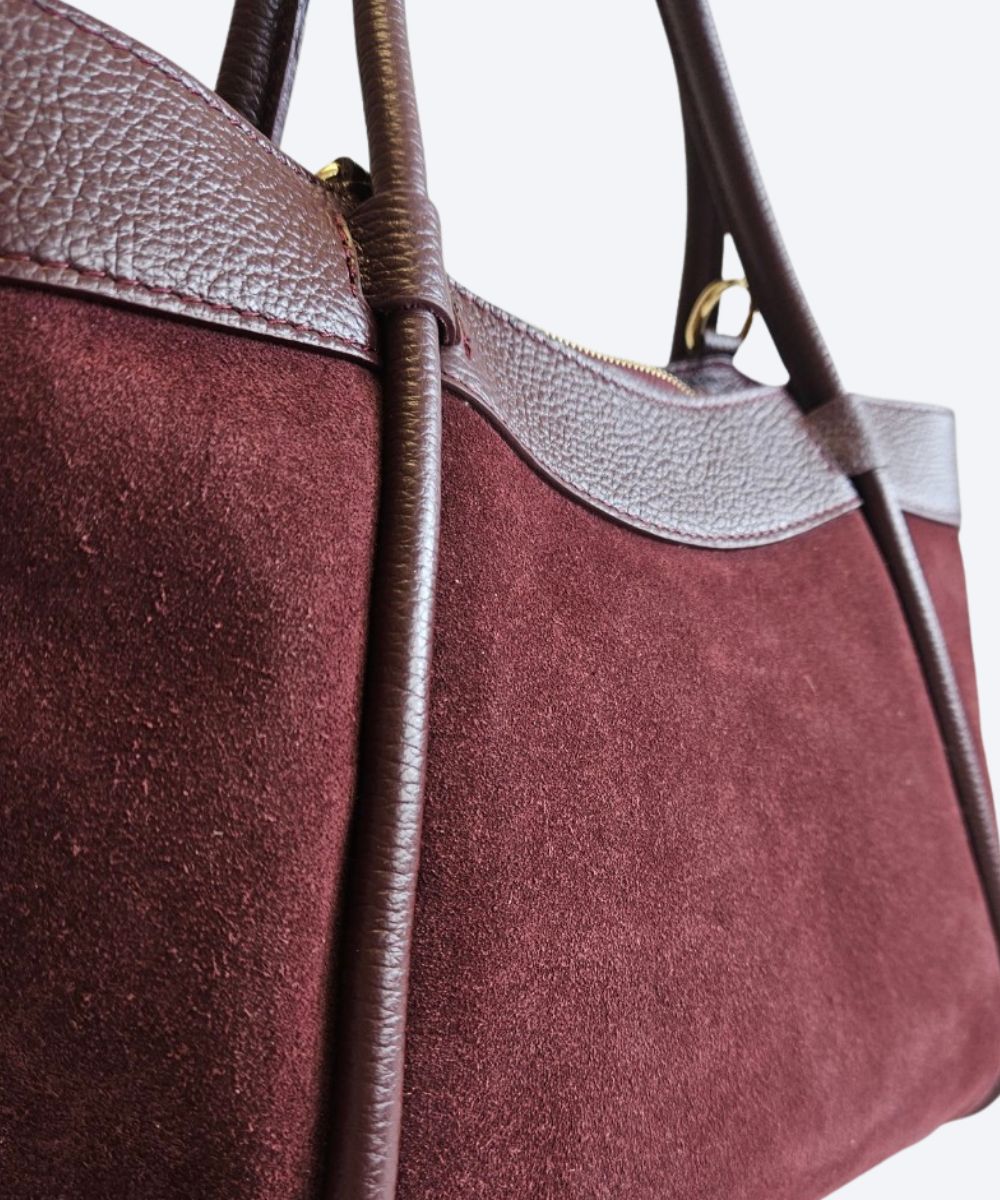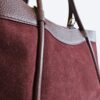Elegancka torebka damska, stylowy dodatek wykonany z wysokiej jakości skóry naturalnej zamszowej w głębokim, burgundowym kolorze. Torebka charakteryzuje się połączeniem miękkiego zamszu na korpusie z gładkimi, skórzanymi wykończeniami i rączkami, co nadaje jej wyrafinowany wygląd. Torebka zapinana od góry na zamek błyskawiczny Wszechstronny model typu tote, idealny zarówno do codziennych, jak i bardziej formalnych stylizacji.