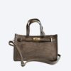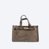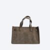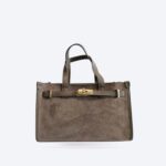 Torebka wykonana jest z naturalnego zamszu w kolorze brązowym lub taupe. Materiał ten jest miękki, matowy i kojarzony z luksusem oraz stylem boho. Jest to model o strukturalnym, prostokątnym kształcie, przypominający fason kuferka lub małej torebki typu tote Posiada solidne, krótkie rączki do noszenia w dłoni. Wyposażona jest w długi, odpinany pasek, umożliwiający noszenie jej na ramieniu lub jako listonoszkę. Zapięcie to metalowy, złoty zamek obrotowy (turn-lock clasp) umieszczony centralnie na przedniej klapie .Elementami ozdobnymi są poziome paski z tego samego materiału, przechodzące przez metalowe szlufki, co nadaje jej elegancki wygląd. Dzięki szlachetnemu wyglądowi i fakturze, torebka ma ponadczasowy charakter i pasuje do wielu stylizacji, zarówno jesienno-zimowych, jak i letni
