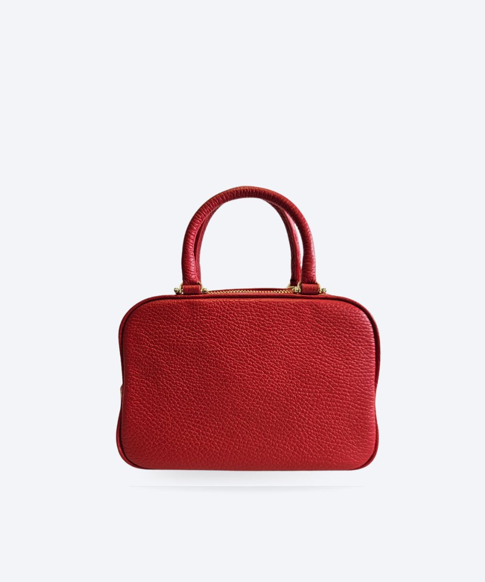 Elegancka, torebka damska ze skóry naturalnej o fasonie kuferka lub listonoszki, charakteryzująca się ziarnistą fakturą . Torebka posiada usztywnioną formę z zaokrąglonymi rogami. Wyposażona jest w krótkie, podwójne rączki do noszenia w dłoni oraz długi, regulowany i odpinany pasek, który umożliwia noszenie jej na ramieniu lub jako listonoszkę (crossbody). Zamykana na złoty zamek błyskawiczny. Metalowe okucia oraz karabińczyki przy pasku są w kolorze złotym, co dodaje jej luksusowego charakteru.