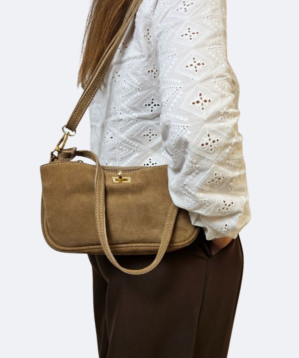 Prosta torebka zamszowa , z regulowanym paskiem na ramię . Torebka posiada kieszonki na telefon , klucze , inne drobiazgi .