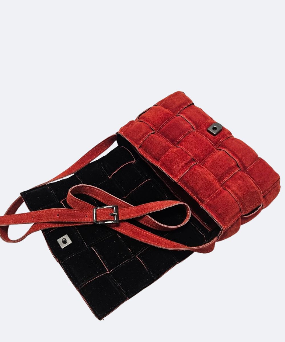 Torebka zamszowa z wzorem przeplatanym ,w środku posiada kieszonkę na dokumenty ,Torebka listonoszka o wyjątkowym kształcie, wykonana ze skóry naturalnej bydlęcej , zamykana klapką na zatrzask , Środek torebki to jedna komora z kieszonką na zamek .