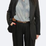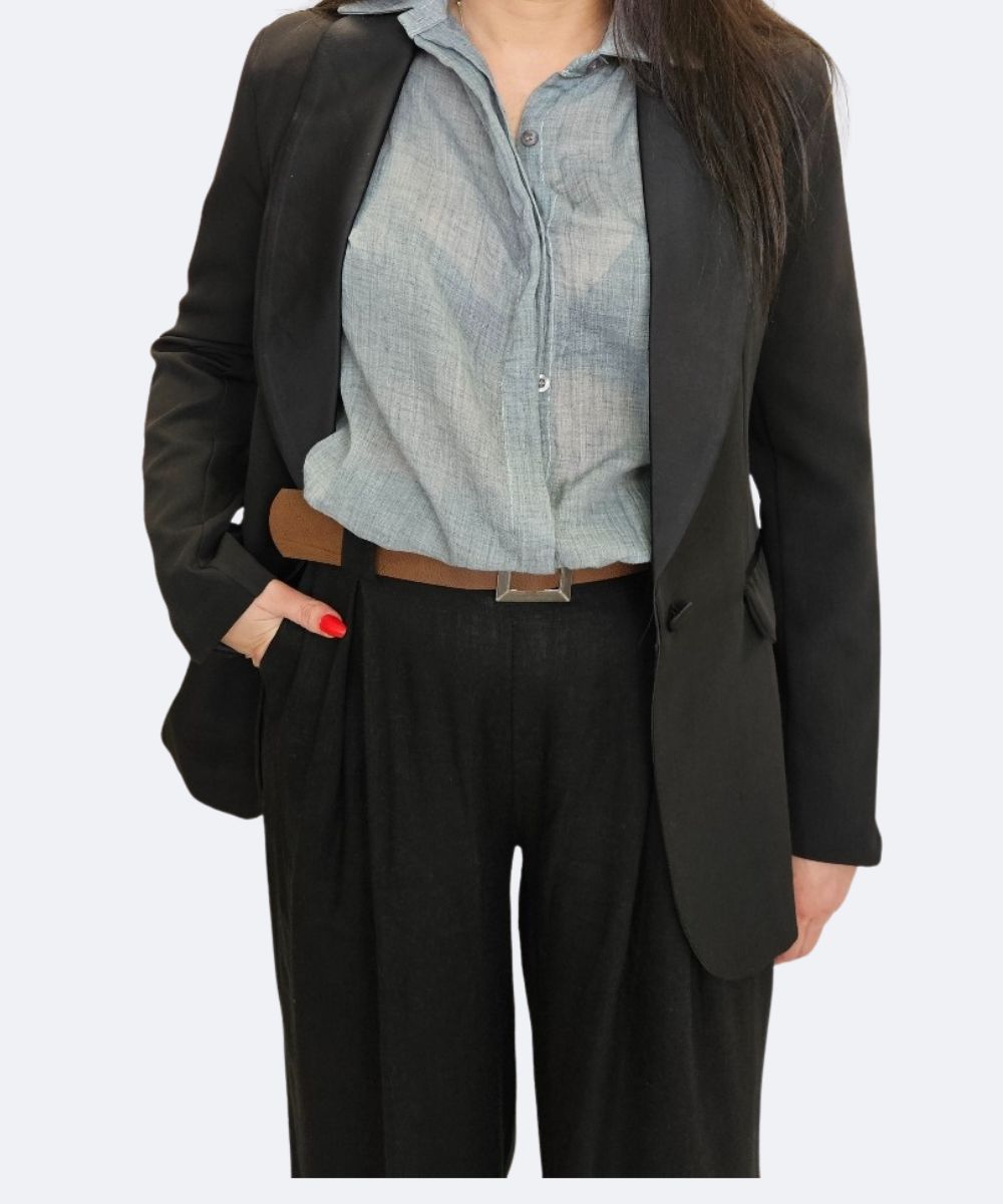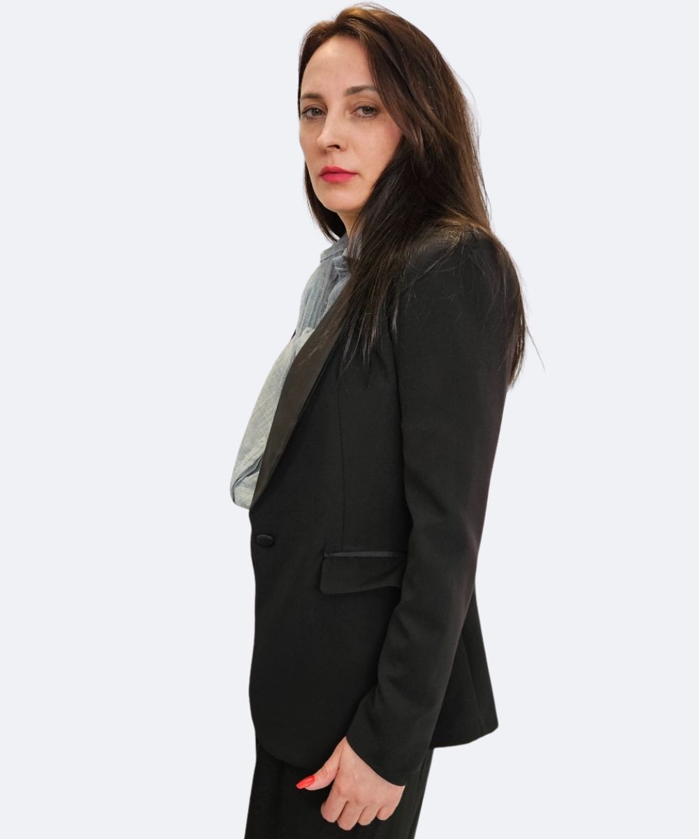 Elegancki żakiet damski o ładnym kroju dopasowanym do talji .Klasyczny, jednorzędowy żakiet, który jest podstawą wielu stylizacji i dodaje im szyku. Do żakietu możesz dokupić [dostępna na stronie] jasną, przewiewna koszulę , która rozjaśnia ciemny zestaw i dobrze komponuje się z czernią.